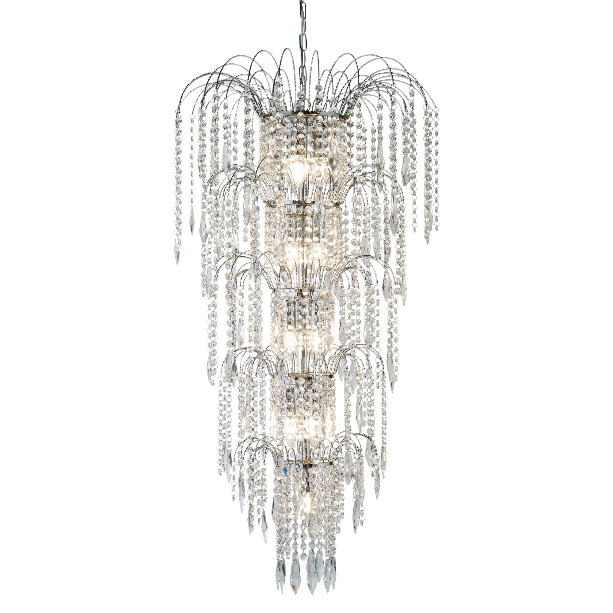 This 13 light chandelier features sleek curved chrome finish arms around a decorative central frame, with overlapping tiers of shimmering crystal buttons and drops that create a picturesque cascading light effect and form a dramatic Waterfall effect when illuminated.