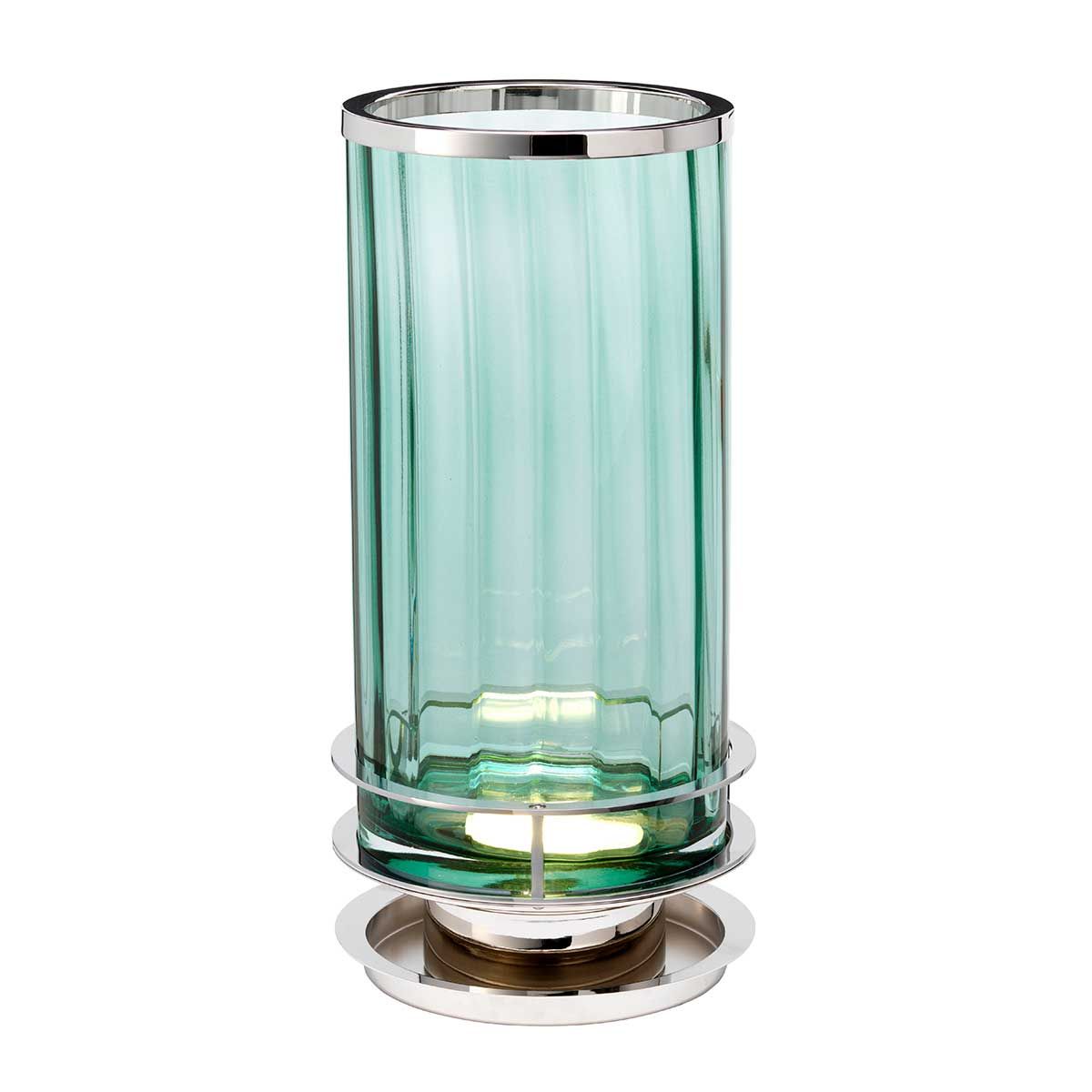 Blown glass obelisk table lamp with a prismatic texture and Green tint. The light source is hidden in the base with fine metal detailing in Polished Nickel.