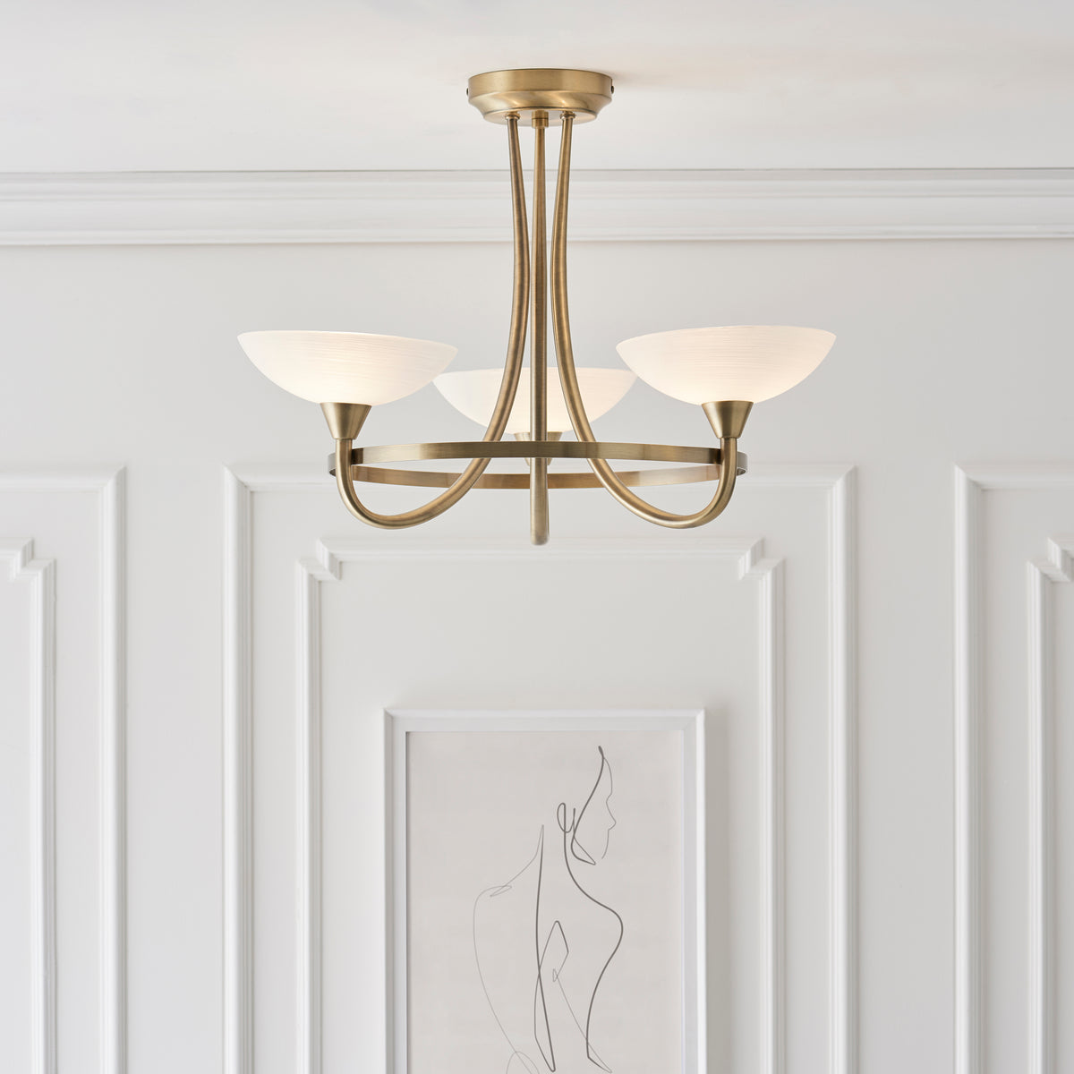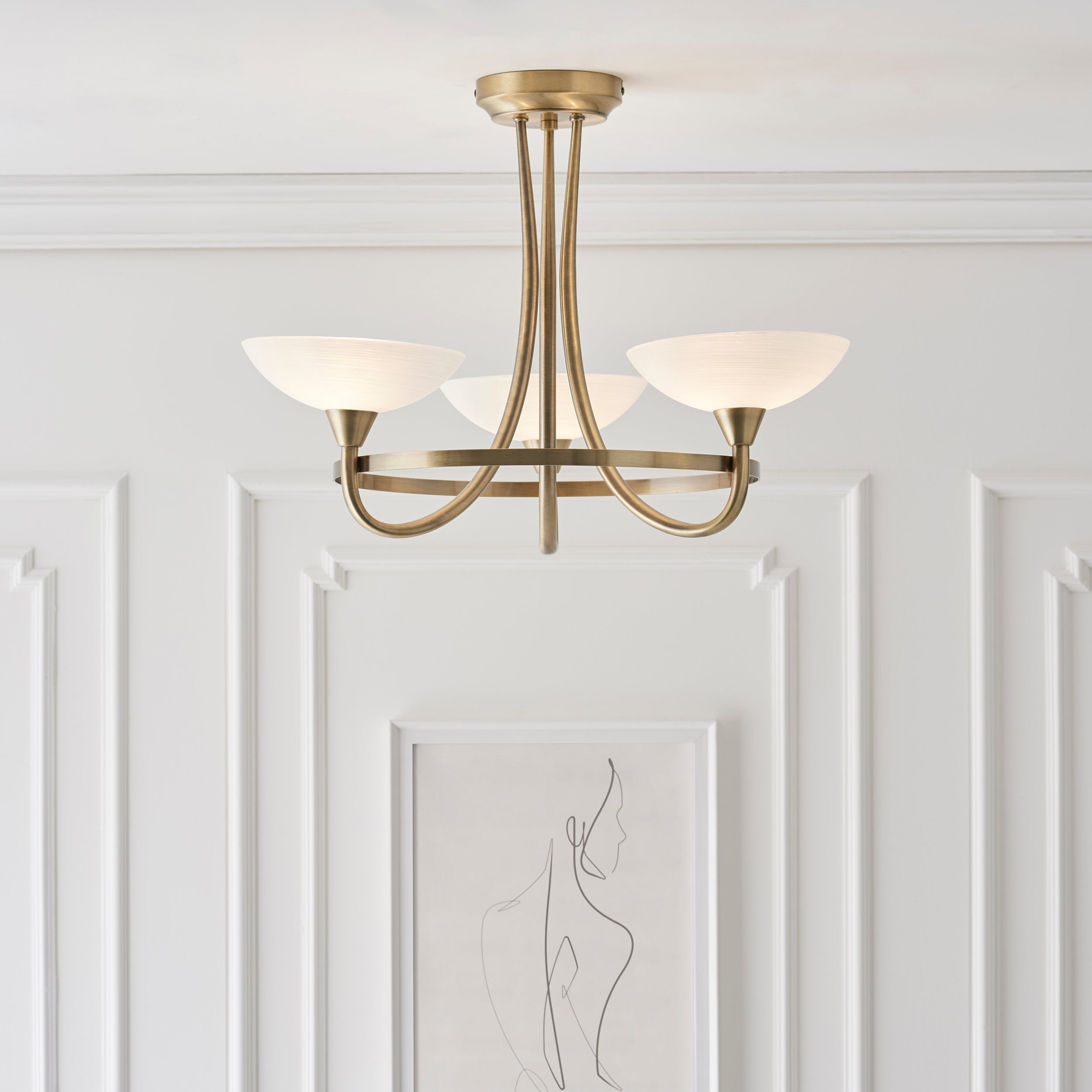 The Cagney 3 light semi flush is finished in antique brass effect with white painted glass shades with faint line detailing. suitable for use with LED lamps and dimmable; matching 5 light semi flush and wall light options and satin chrome finish also available