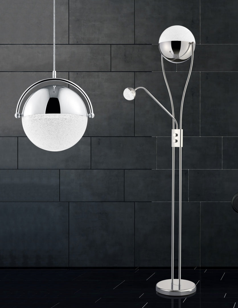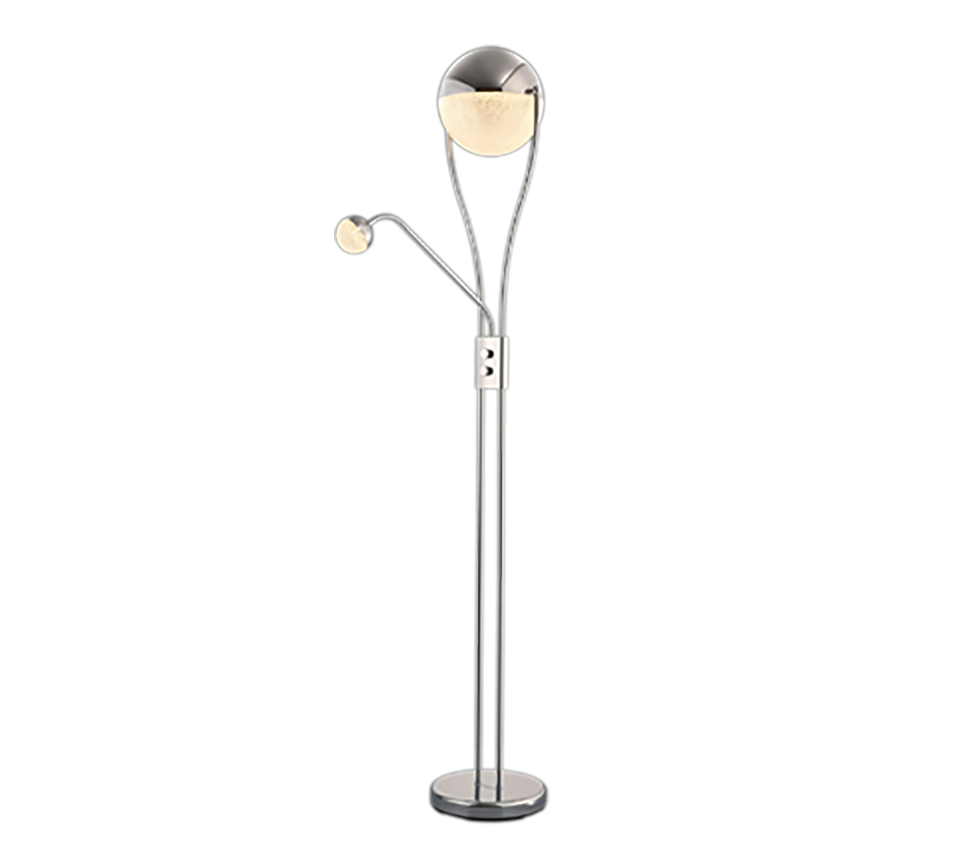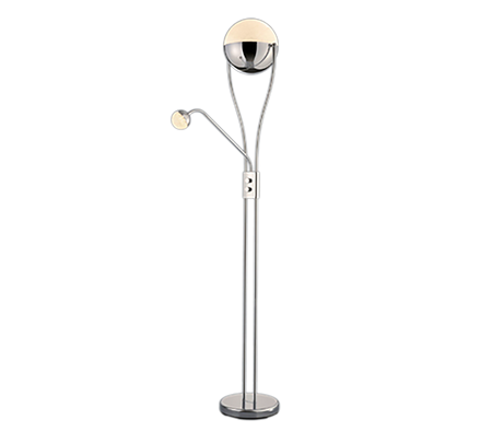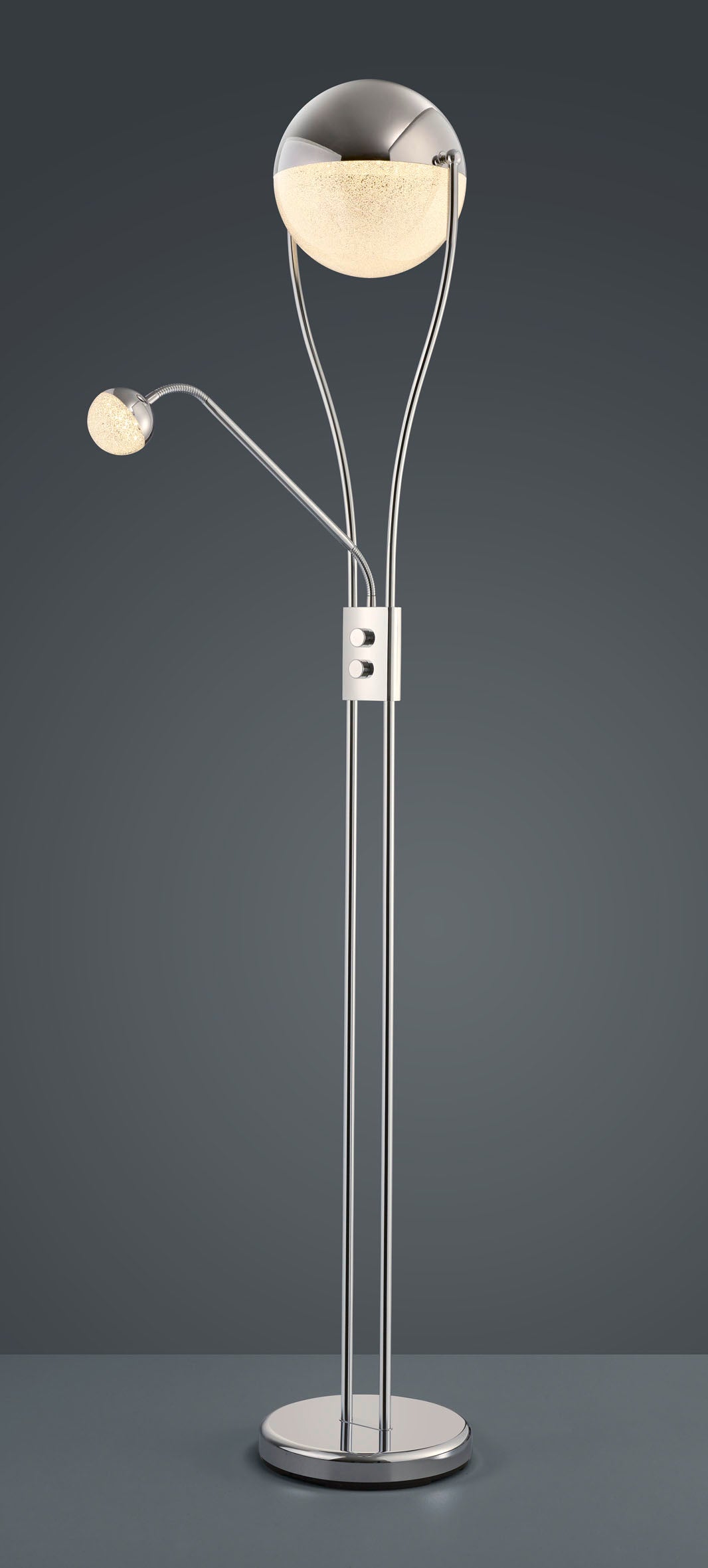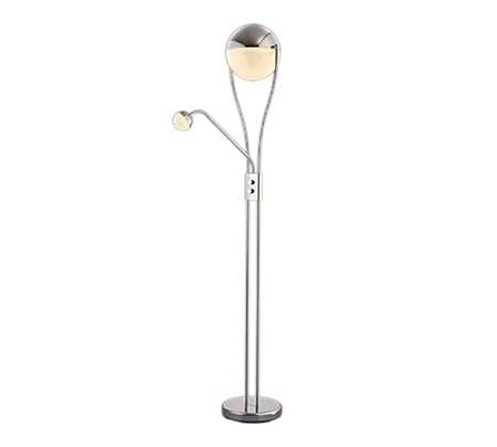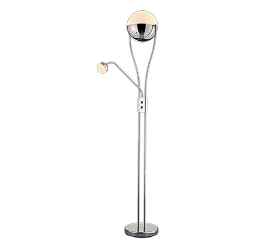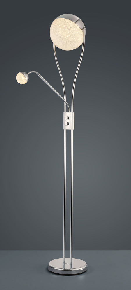 With the CHRIS floor lamp, you can create a cosy atmosphere on the one hand, but also have the option of creating enough light to read a book thanks to the flexible reading arm. The design of the classic floor lamp is enhanced by the spherical light sources, making CHRIS a modern decorative element. The lamp has a height of 180 cm and a width of 30 cm. The chrome-coloured metal stands for timelessness and modernity. It can also be combined well with other colours and materials. In addition, the luminaire features modern LED technology, which is characterised by high light quality and energy efficiency. Compared to conventional halogen lamps, up to 80% of energy costs can be saved. In addition, LED light sources have a long service life, produce less heat and protect the environment.