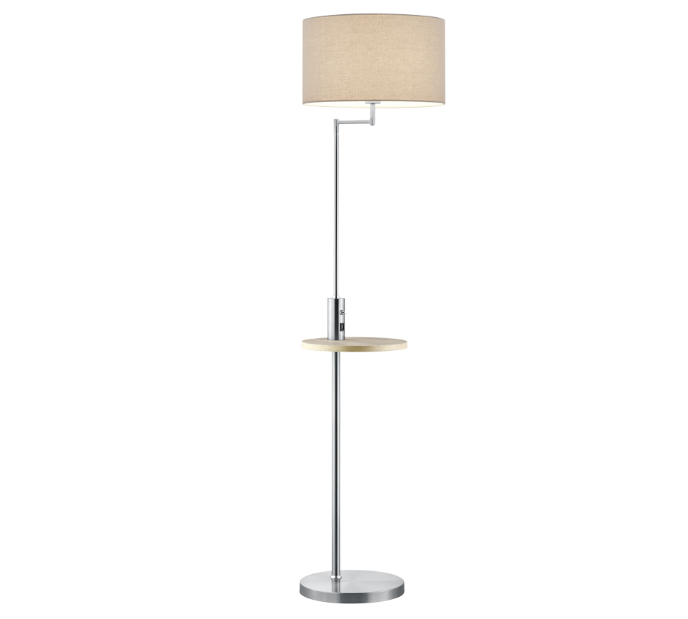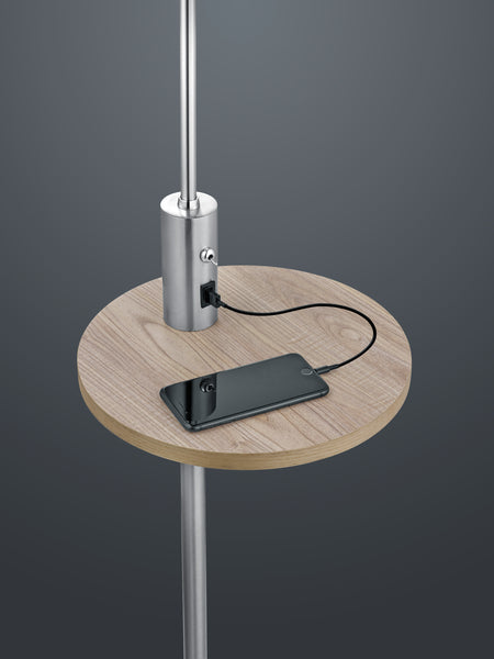 The modern CLAAS floor lamp is perfect for placing in the hallway or next to the sofa and creates lighting accents that give your living space a cosy ambience. The floor lamp also has a small wooden table and a USB port with charging function, making it ideal for placing your mobile phone next to the sofa and charging it at the same time, for example. The practical lamp is 160 cm high and has a 40 cm projection. The combination of matt nickel and the grey fabric shade, together with the wooden table, gives the light a modern appearance. The use of LED light sources is recommended for energy-saving lighting. These are an ideal alternative to conventional halogen light sources and offer high light quality and energy savings of up to 80%. With LED light sources, you also benefit from a long service life and low heat generation while protecting the environment.