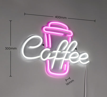 The Coffee LED wall light features a trendy logo style and is used for interior lighting decoration. Colourful LEDs are integrated into a transparent perspex panel and are powered via a USB cable (excluding plug-in transformer).