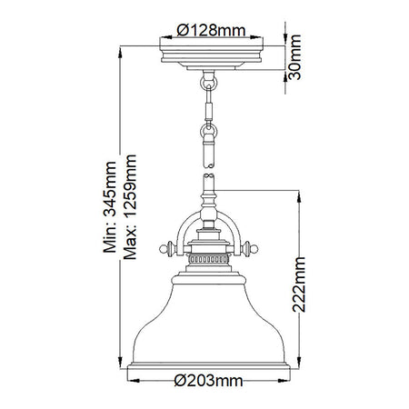 Dimensions : H: 222mm D: 203mm Min/Max Drop: 345mm - 1259mm