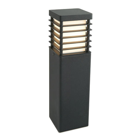 Halmstad medium bollard by Norlys is constructed with treated pine wood, has black powder coated steel elements with an opal polycarbonate diffusers It is IP65 rated is suitable to use on the coastline.