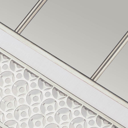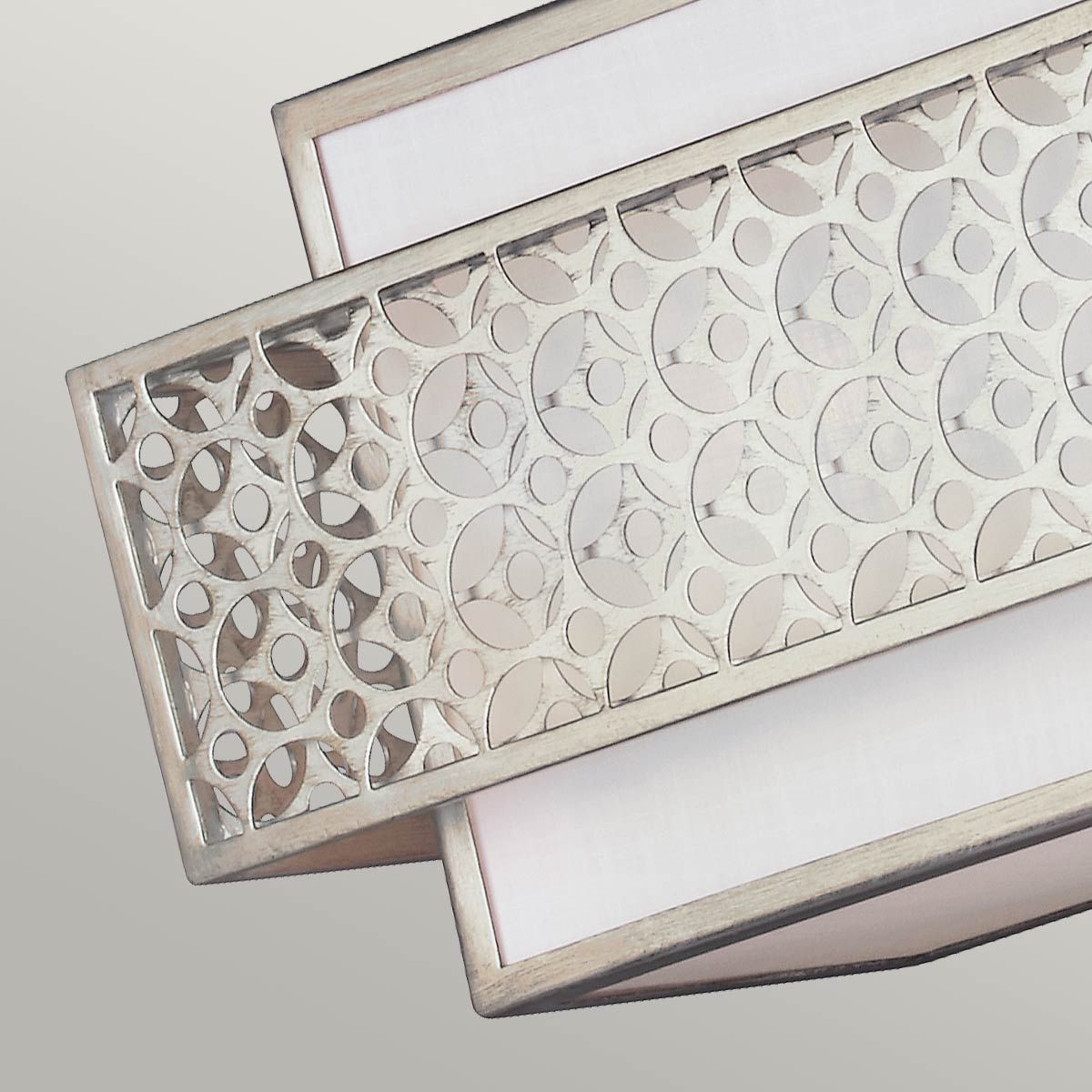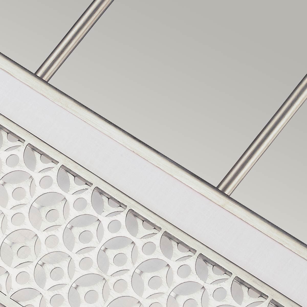 The contemporary Kenney collection is an updated take on a classic, mid-century modern design in a refined Sunrise Silver finish. A decorative, dual-layered, geometric motif is stamped out of the steel frame which floats over a white linen shade to create depth and visual interest.