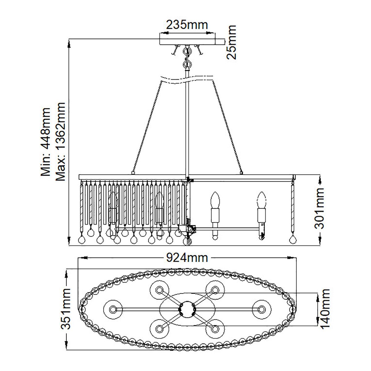 Dimensions : H: 313mm W: 916mm D: 343mm Min/Max Drop: 448mm - 1362mm