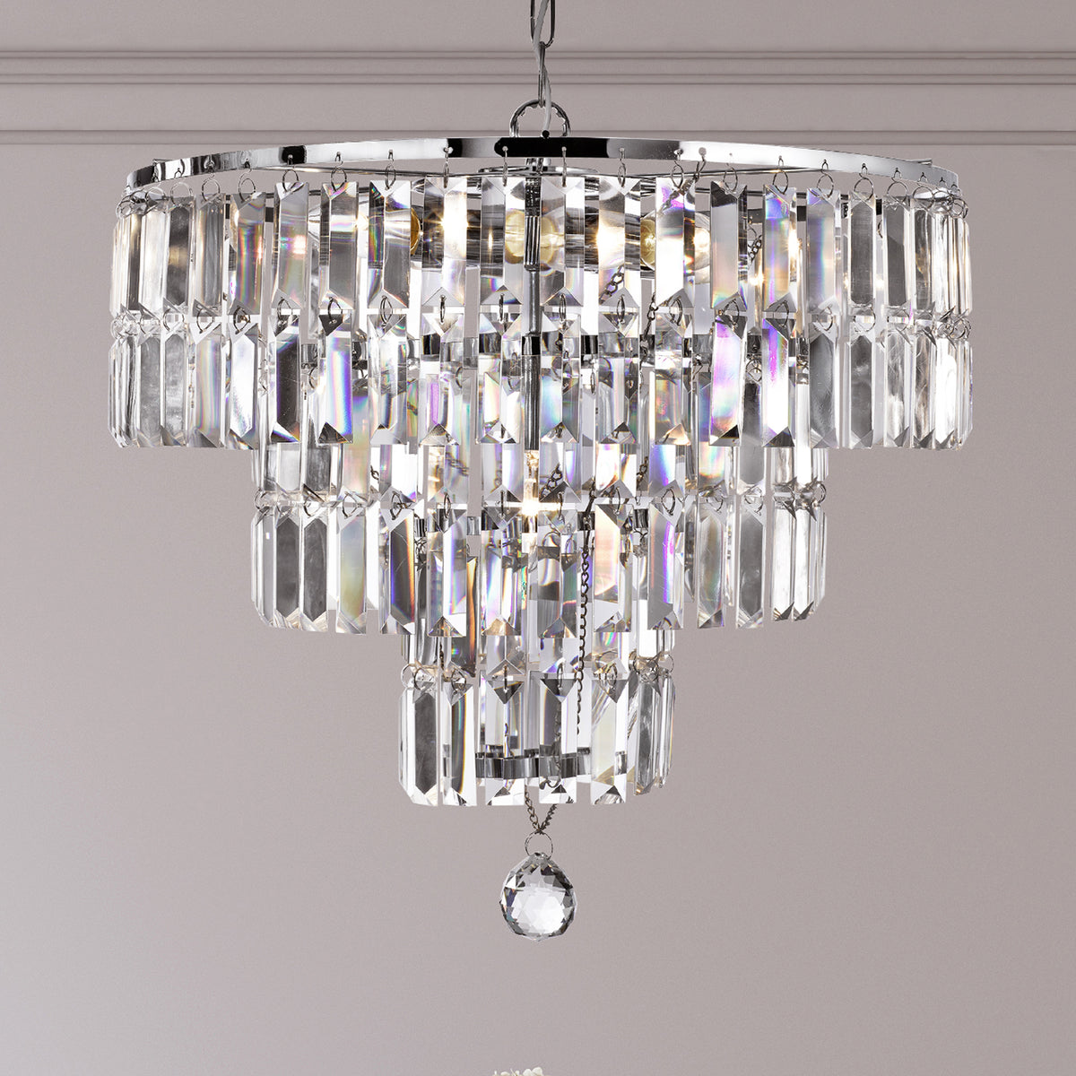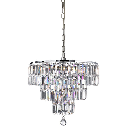 Chrome Metal & Clear Crystal: Empire is a spectacular, glittering 5 light chandelier with stunning rectangular crystal prisms hanging from a modern, chrome finish frame. Create a scintillating, jewellery-like effect with this impactful piece as the main feature in your living area or dining room. The Empire 5Lt Pendant is a stunning combination of elegance and functionality. With its five lights, exquisite clear crystal pieces and chrome detail, this chandelier creates a captivating lighting effect that will transform any space into a sophisticated haven. Designed with a tiered structure, the pendant showcases a timeless and luxurious aesthetic. The 5 lights of the pendant provide ample illumination, ensuring a well-lit environment in medium-sized rooms. Height adjustable up to 1.5m, this stunning clear crystal pendant can be adapted to suit different ceiling heights.