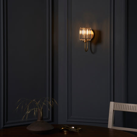 Sophisticated wall light with decorative clear cut faceted glass shade that beautifully disperses the light. An elegant arm in antique brass plate finish, designed to help you create an inviting living space. Other matching items available.