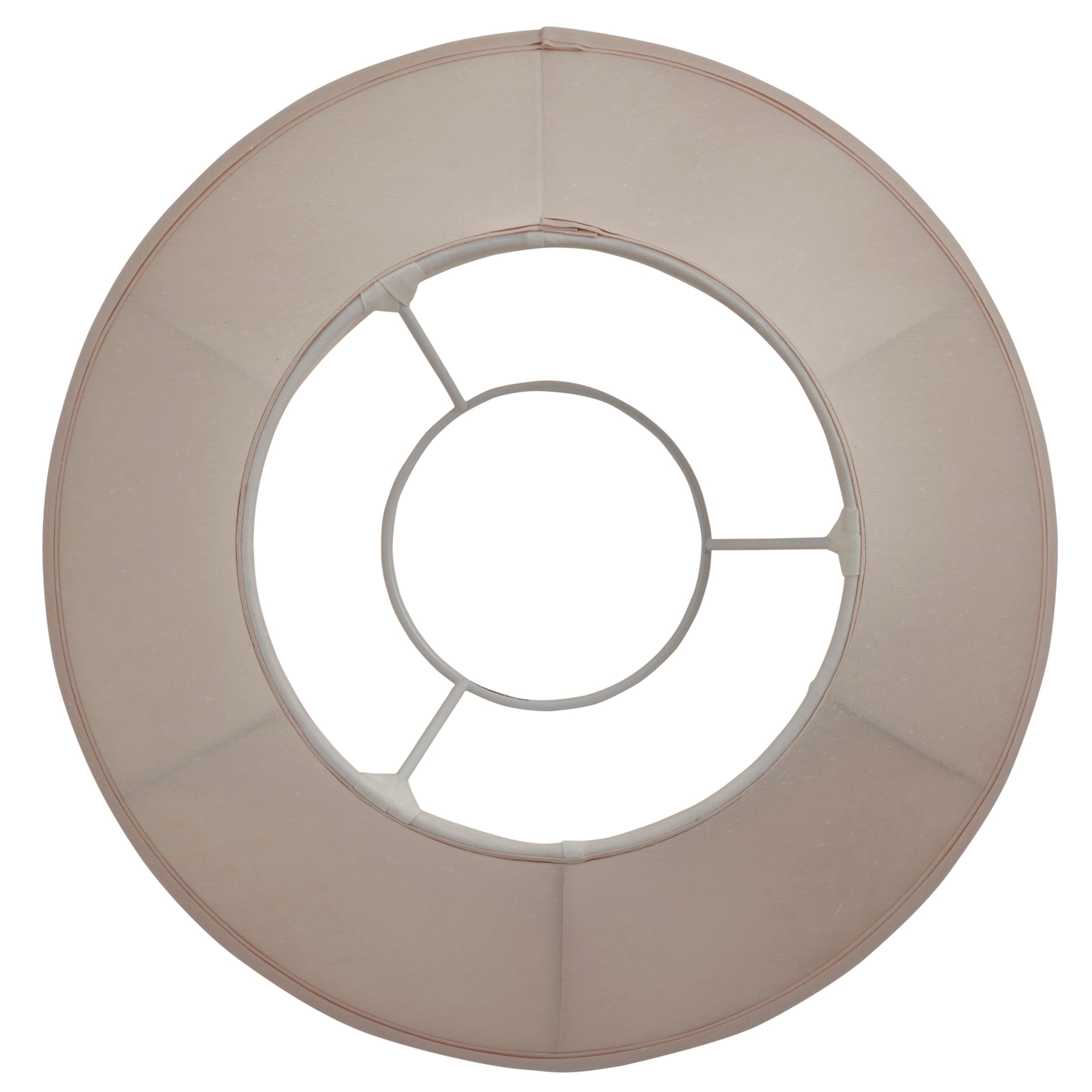 This 16 inch handmade cream lamp shade is shaped in a round bell design and has a double folded trim on the top and bottom. For use with a variety of lamp bases and available in a choice of sizes