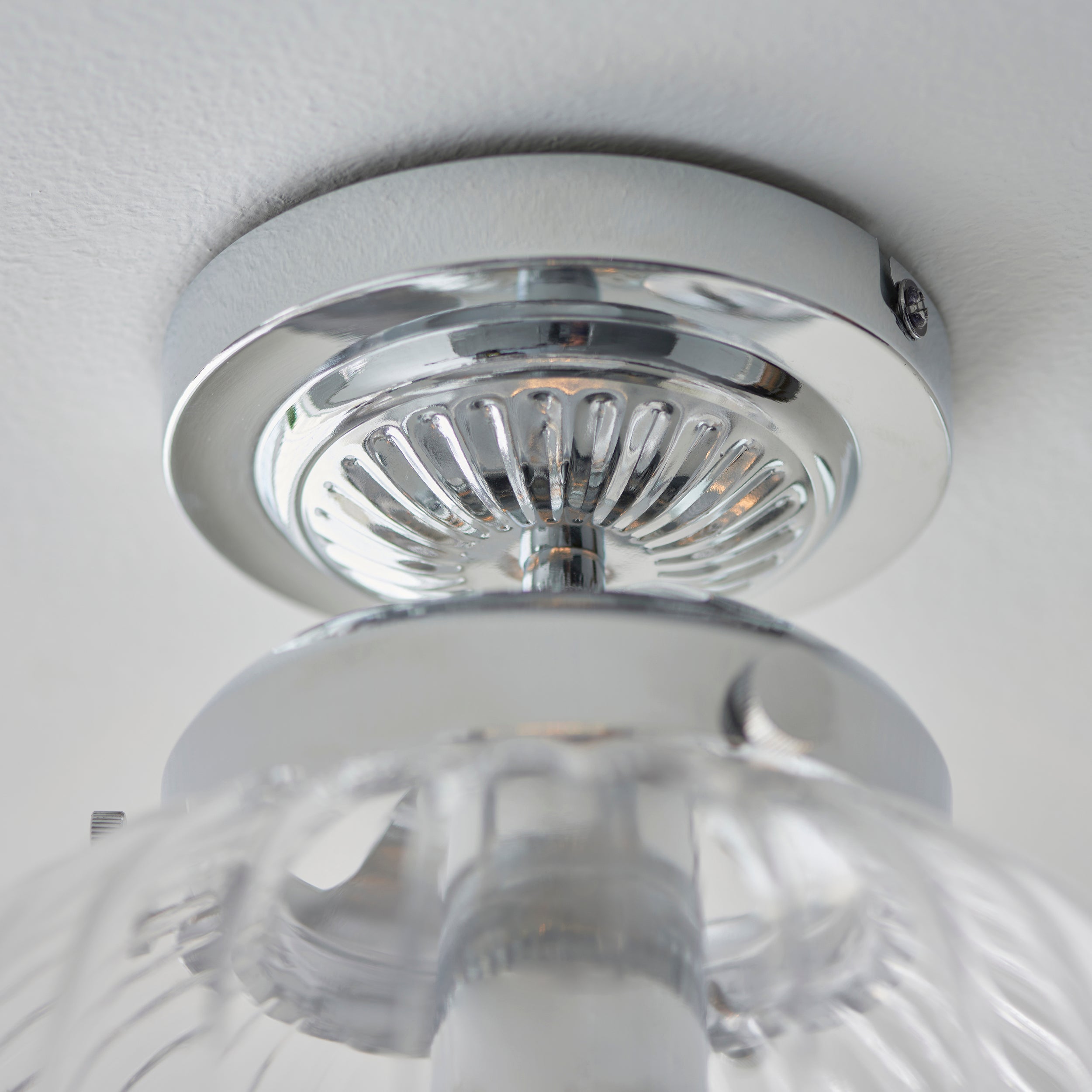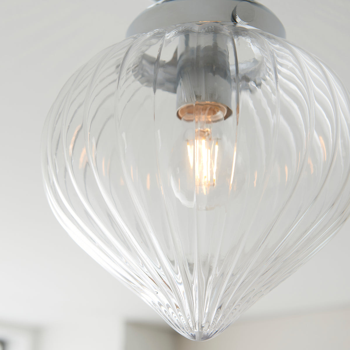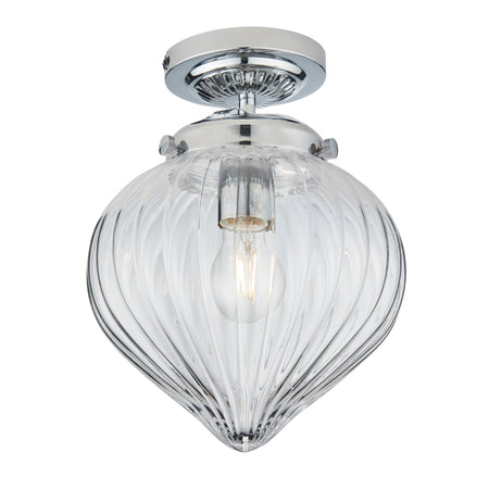 Timeless ceiling light to provide the perfect final touch to a bathroom. With clear ribbed glass shade and chrome finish metal work this light can be dimmed to create a relaxing environment in your bathroom. Perfect for use with E27 LED lamps.