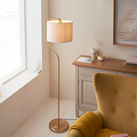 With a modern compact style, this is the ideal floor lamp to place beside your sofa or arm chair. Finished in brushed aged brass with natural linen coloured fabric shade and easy to reach lamp holder on/off switch.
