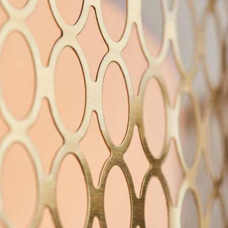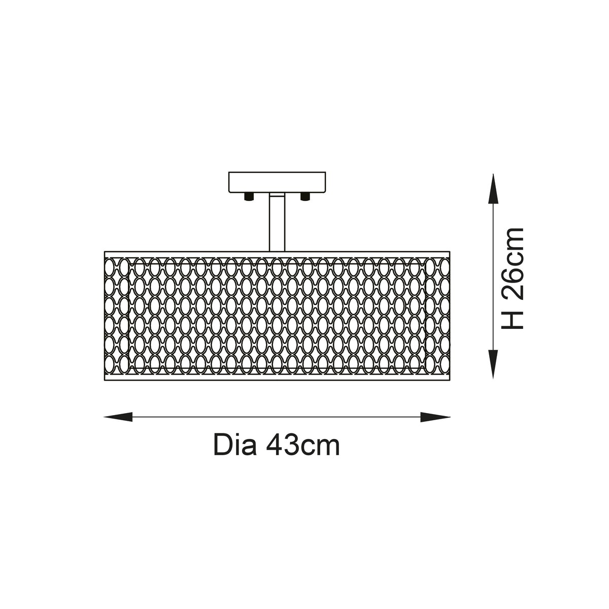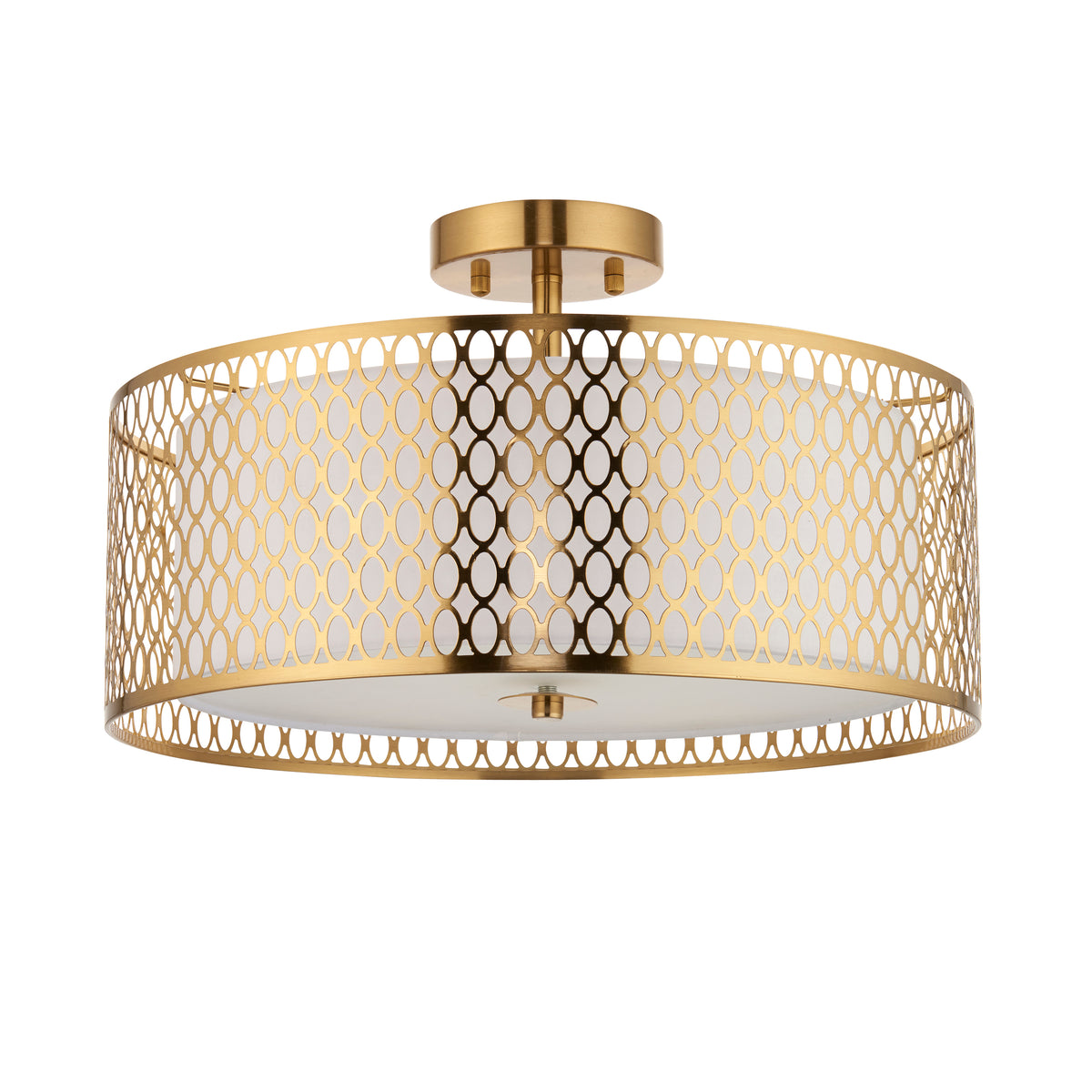 No compromise on design for low ceilings. This is a classic circular light with a trendy geometric fretwork metal outer and an inner fabric shade for lovely light diffusion. In a gold effect plate finish with frosted glass this light would compliment a range of interior style. This product is also dimmable to create a relaxing atmosphere.