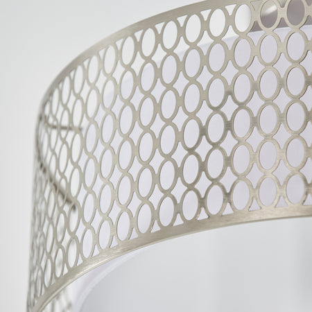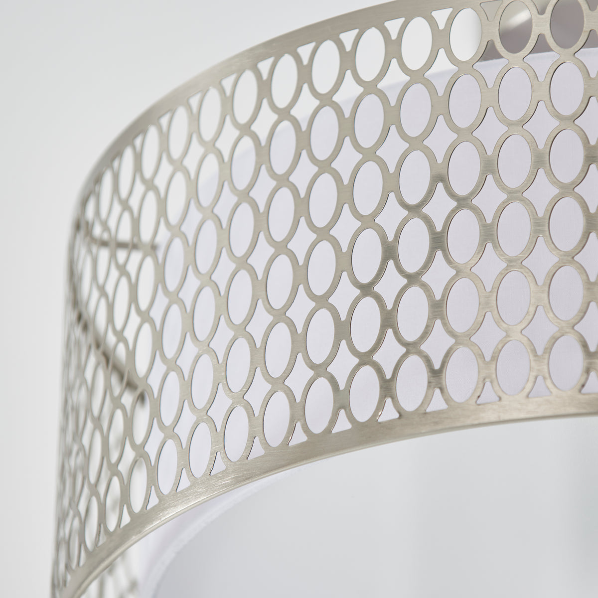 • Satin nickel geometric fretwork with white fabric inner shade