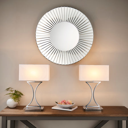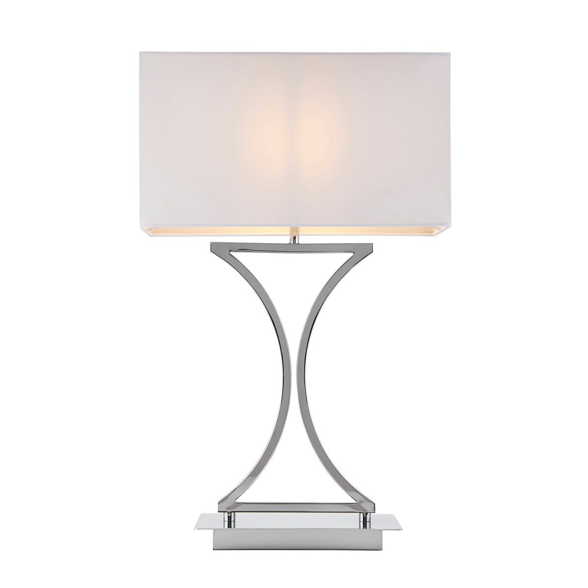 This table lamp features an unusually shaped body atop a rectangle base, all finished in chrome topped with white square shade. suitable for use with LED lamps and supplied with inline switch