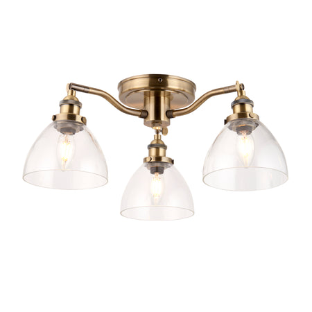 An authentic 'resto' style industrial 3 light semi flush, finished in antique brass plating with authentic knurled lamp holder details and clear glass shades. Pair with filament LED lamps for that perfect industrial style. The perfect addition for today's stylish homes to create that on trend bar, bistro look. Other Family items available.