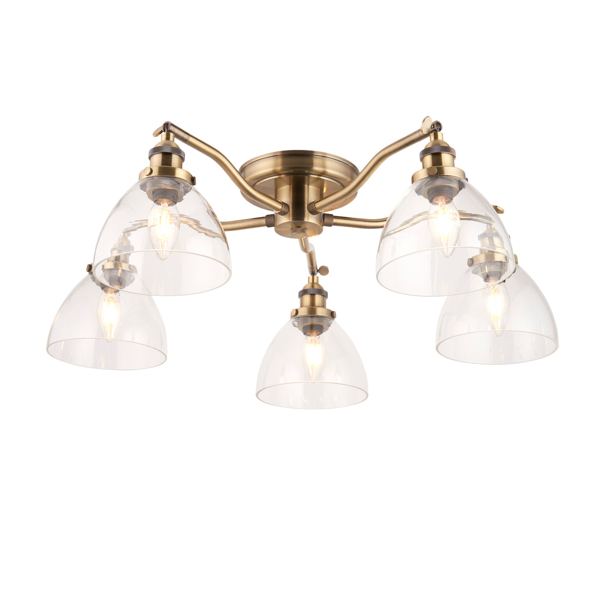 An authentic 'resto' style industrial 5 light semi flush, finished in antique brass plating with authentic knurled lamp holder details and clear glass shades. Pair with filament LED lamps for that perfect industrial style. The perfect addition for today's stylish homes to create that on trend bar, bistro look. Other Family items available.