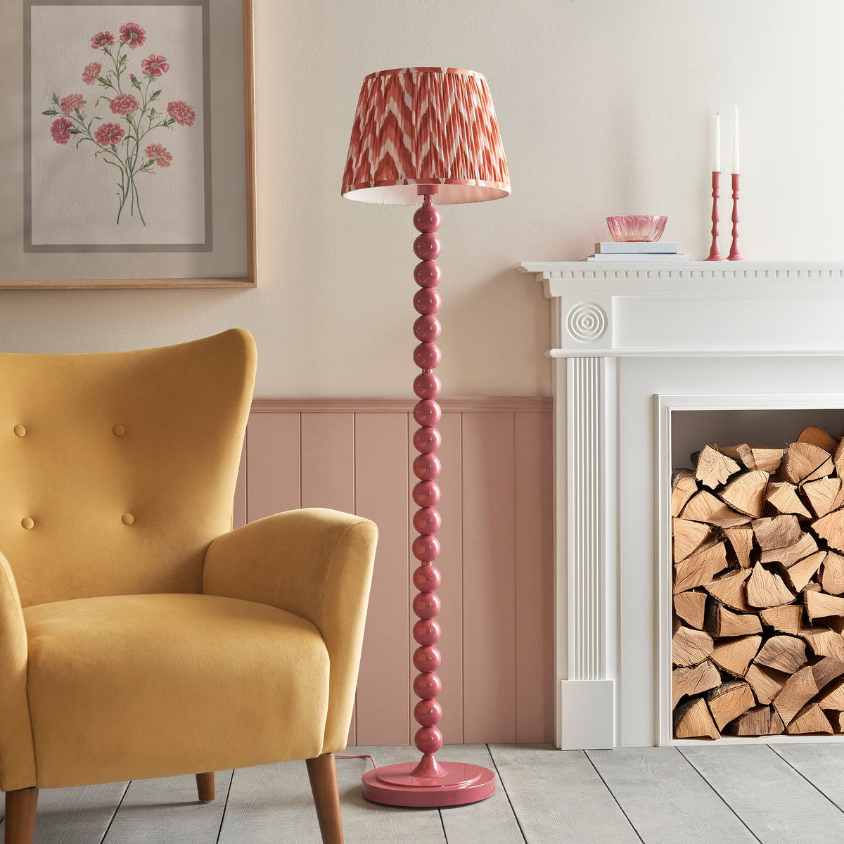 Add some colour to your home with this playful floor light. Multiple stacked metal spheres are finished in gloss pink clay paint with an E27 lamp holder, in-line foot switch and colour matched fabric flex. Paired with bright apricot orange 35cm Zigzag shade to complete this perfect colour addition to your home.
