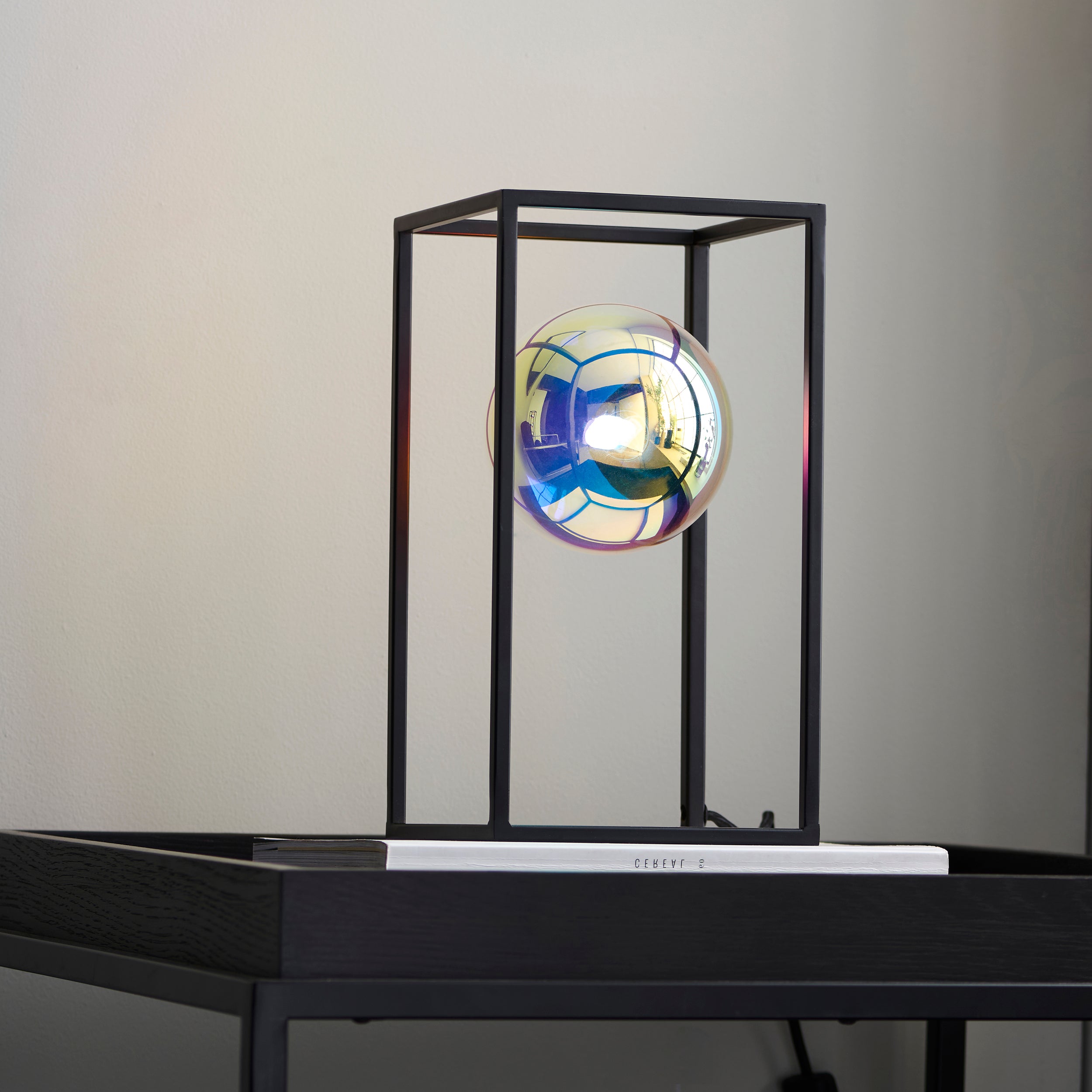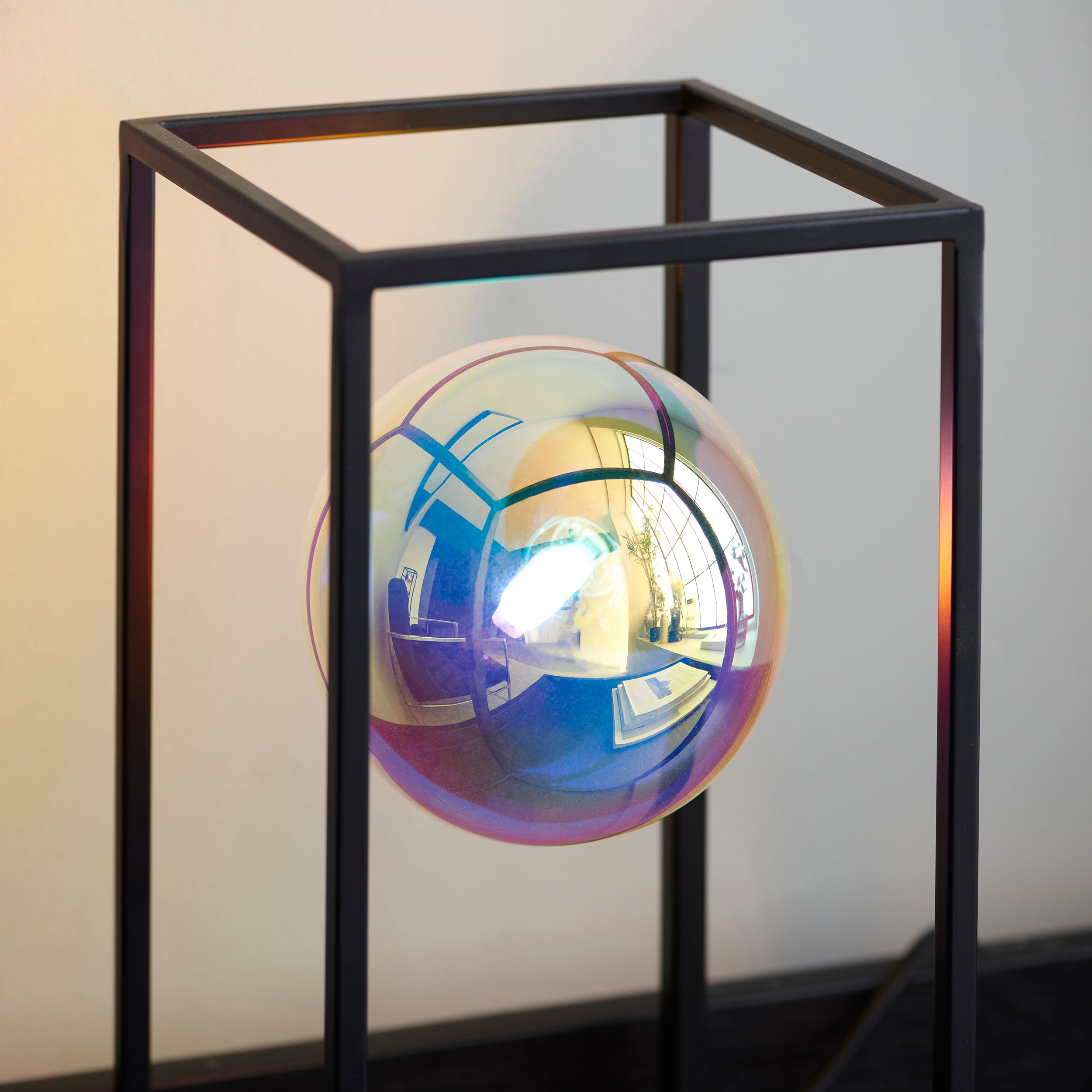 Inventive design with a drop of fun; iridescent spheres appear to float within the black frame of this contemporary table light. Matching floor light also available.