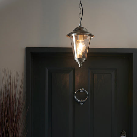 Outdoor pendant lantern constructed from stainless steel and polycarbonate, and comes with a clear vandal resistant diffuser. Dimmable, suitable for use with LED lamps and height adjustable at time of installation. Only suitable for use in covered porches. Matching items available
