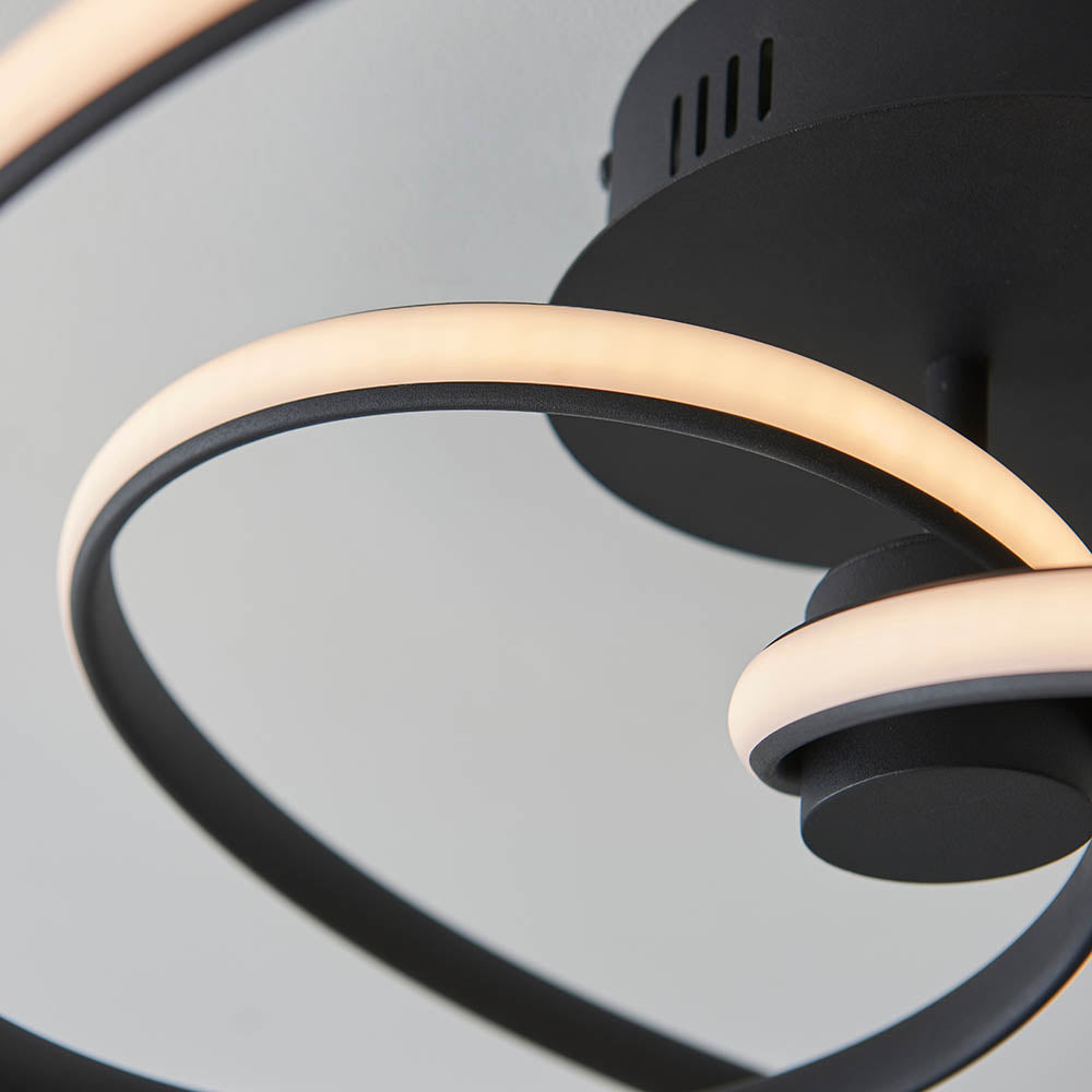 Contemporary design semi flush with texture black finish with white diffuser. Perfect for use in rooms with low ceilings to create warm atmosphere. Dimmable when paired with a trailing edge dimmer switch.