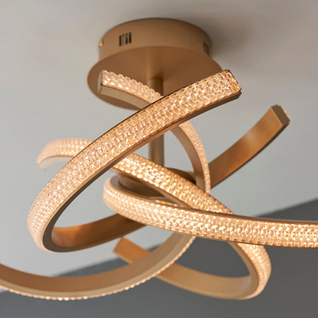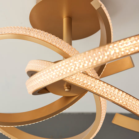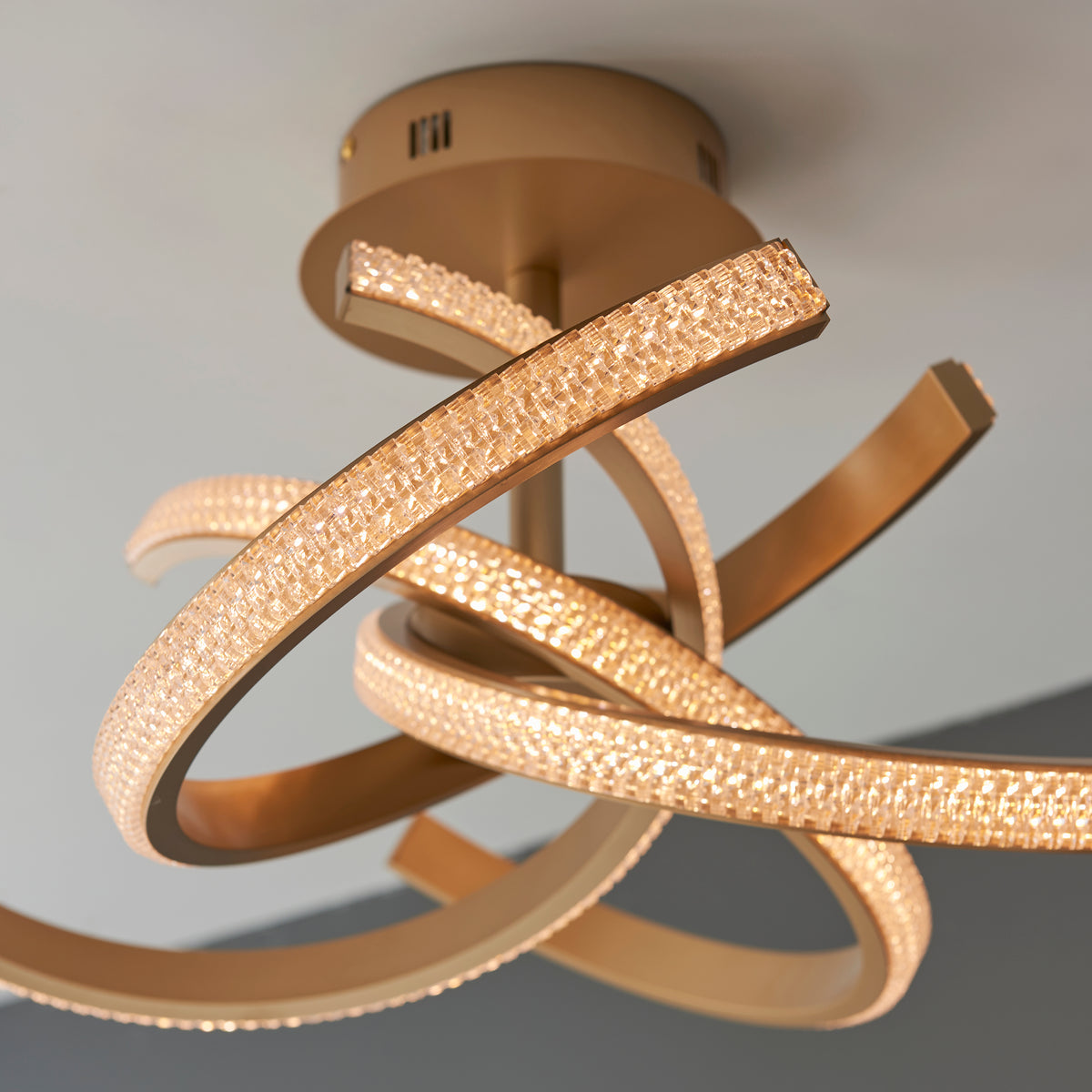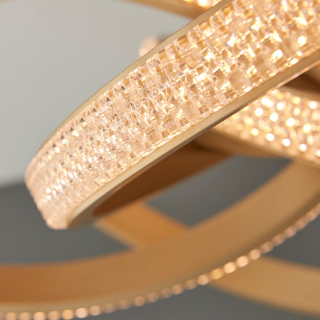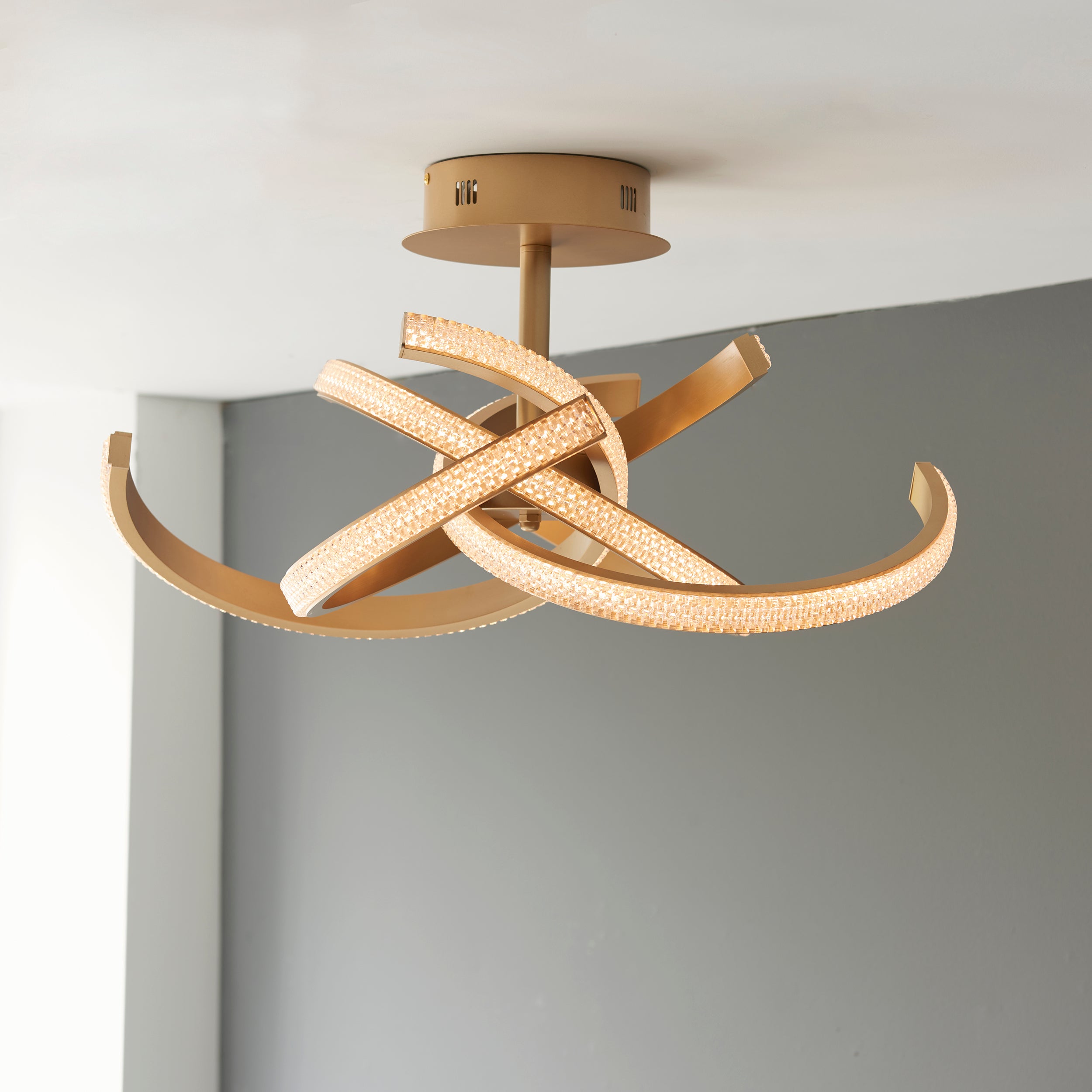 Contemporary designer look semi flush with satin gold painted finish. This stunning pendant is encrusted with thousands of clear faceted reflective detail. Glamorous detail creating luxurious style with matching wall and pendant.