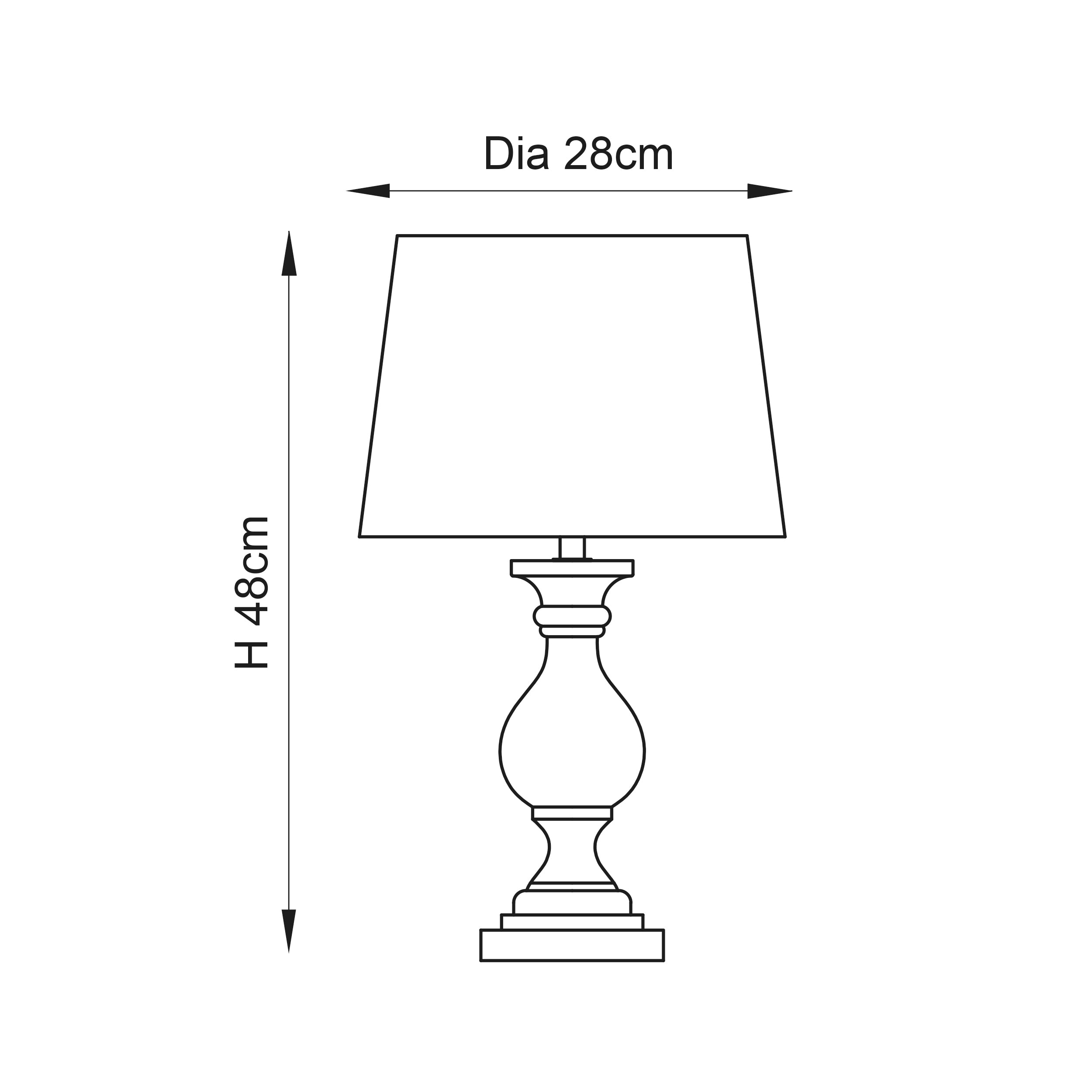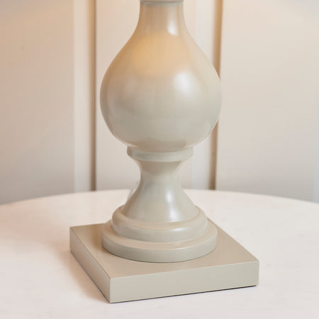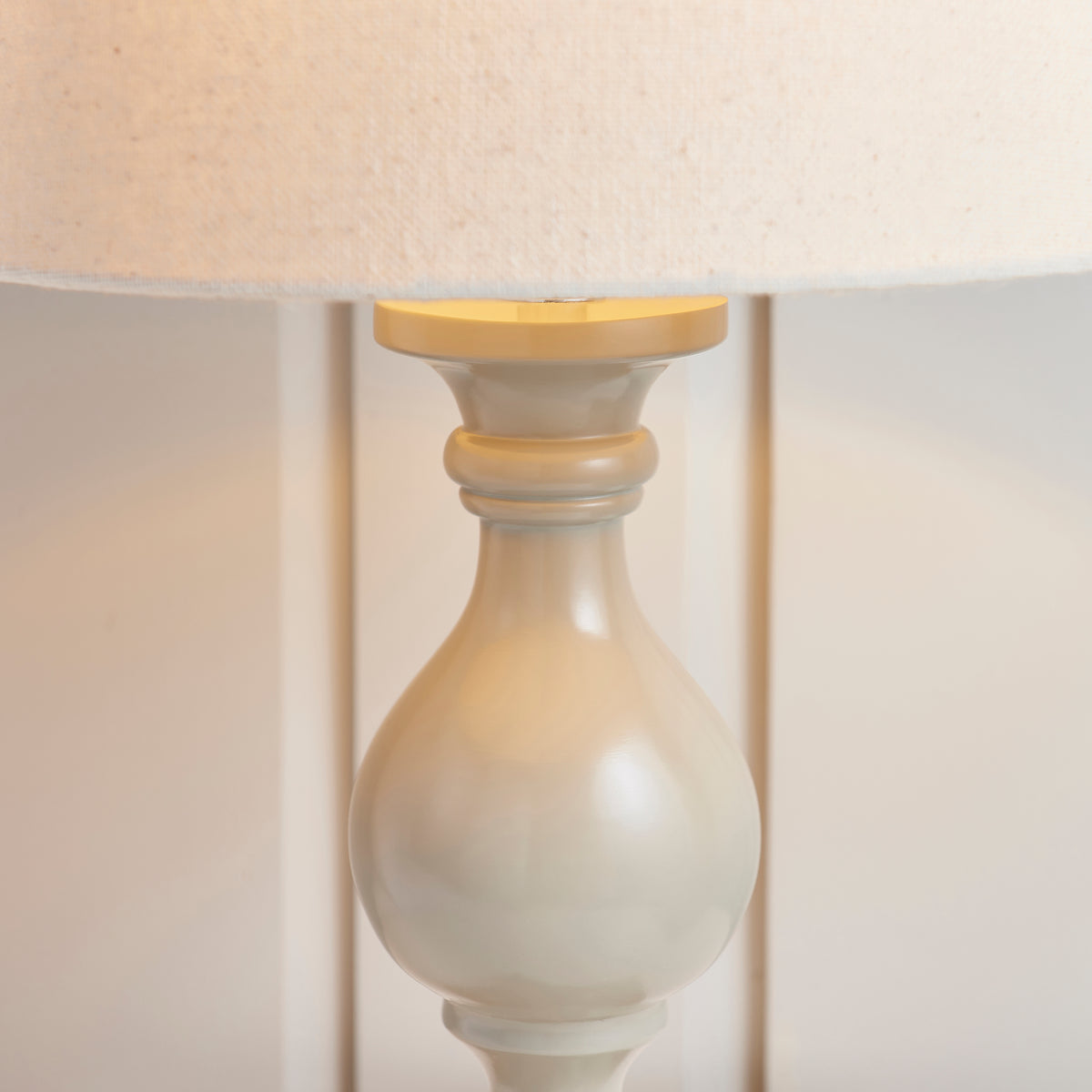 A wooden table lamp finished in a taupe paint and complimented by an ivory linen shade. Comes with an inline switch and suitable for use with LED lamps. Also in ivory