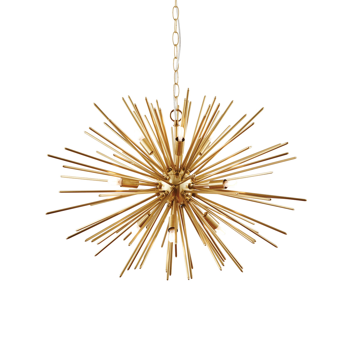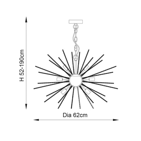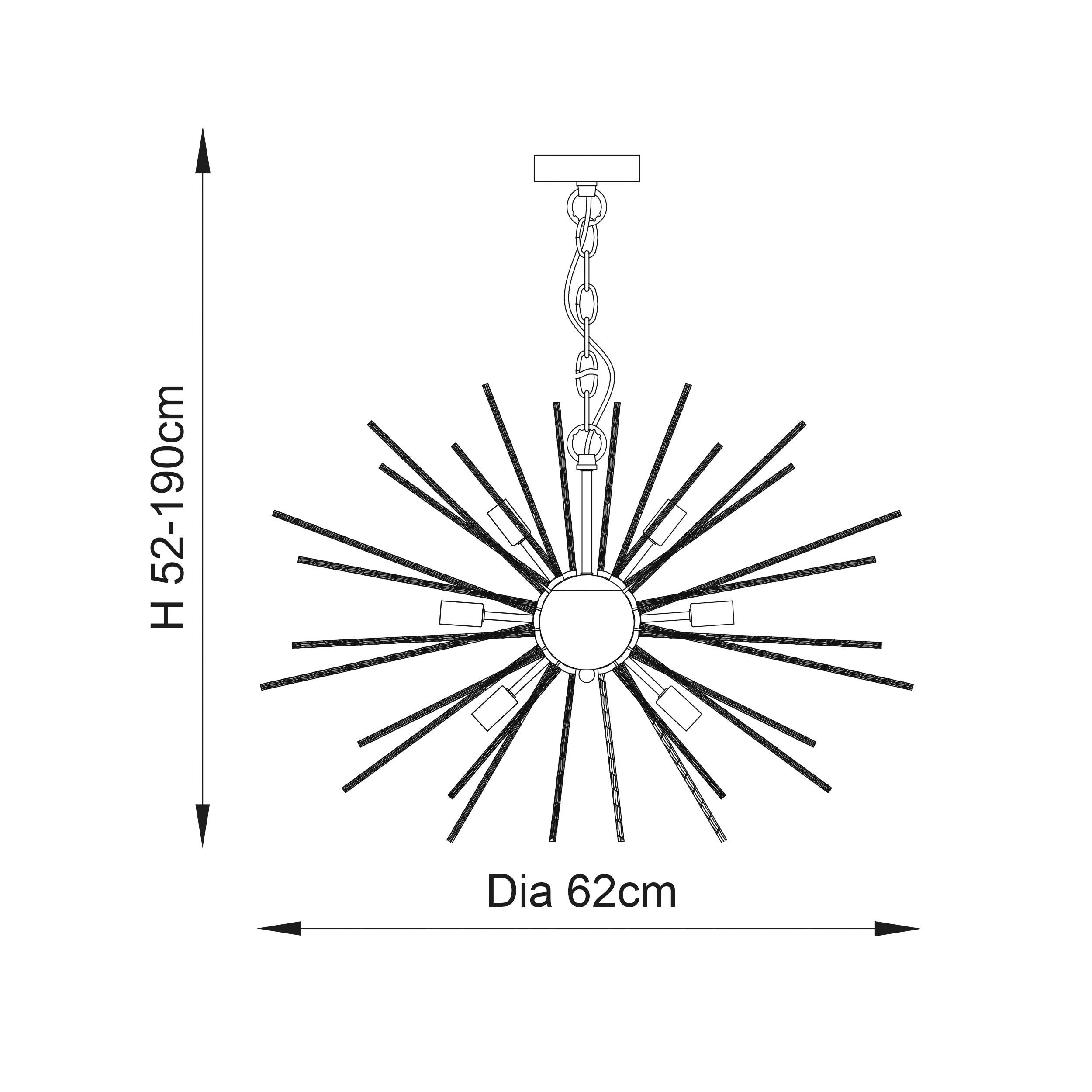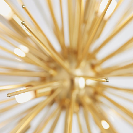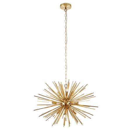 Following the 70's trend this Sputnik style pendant light is finished in satin gold finish. 9 lights are scattered among the metal spikes creating a stunning centrepiece. This product is fully dimmable.