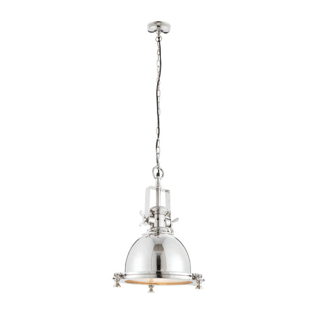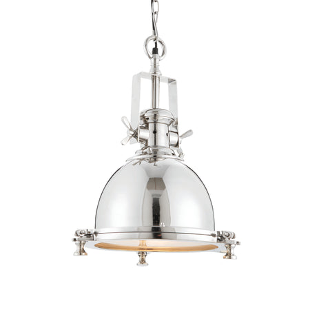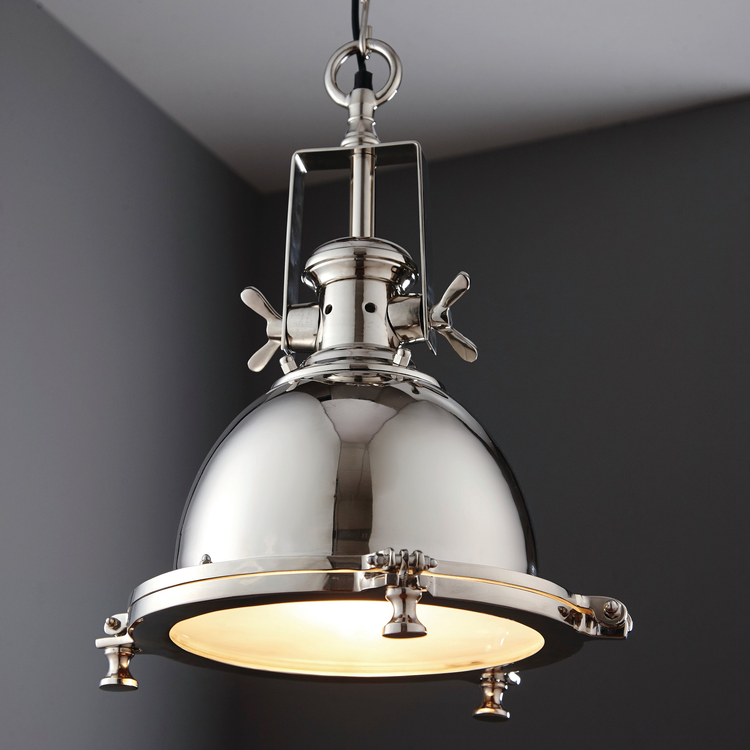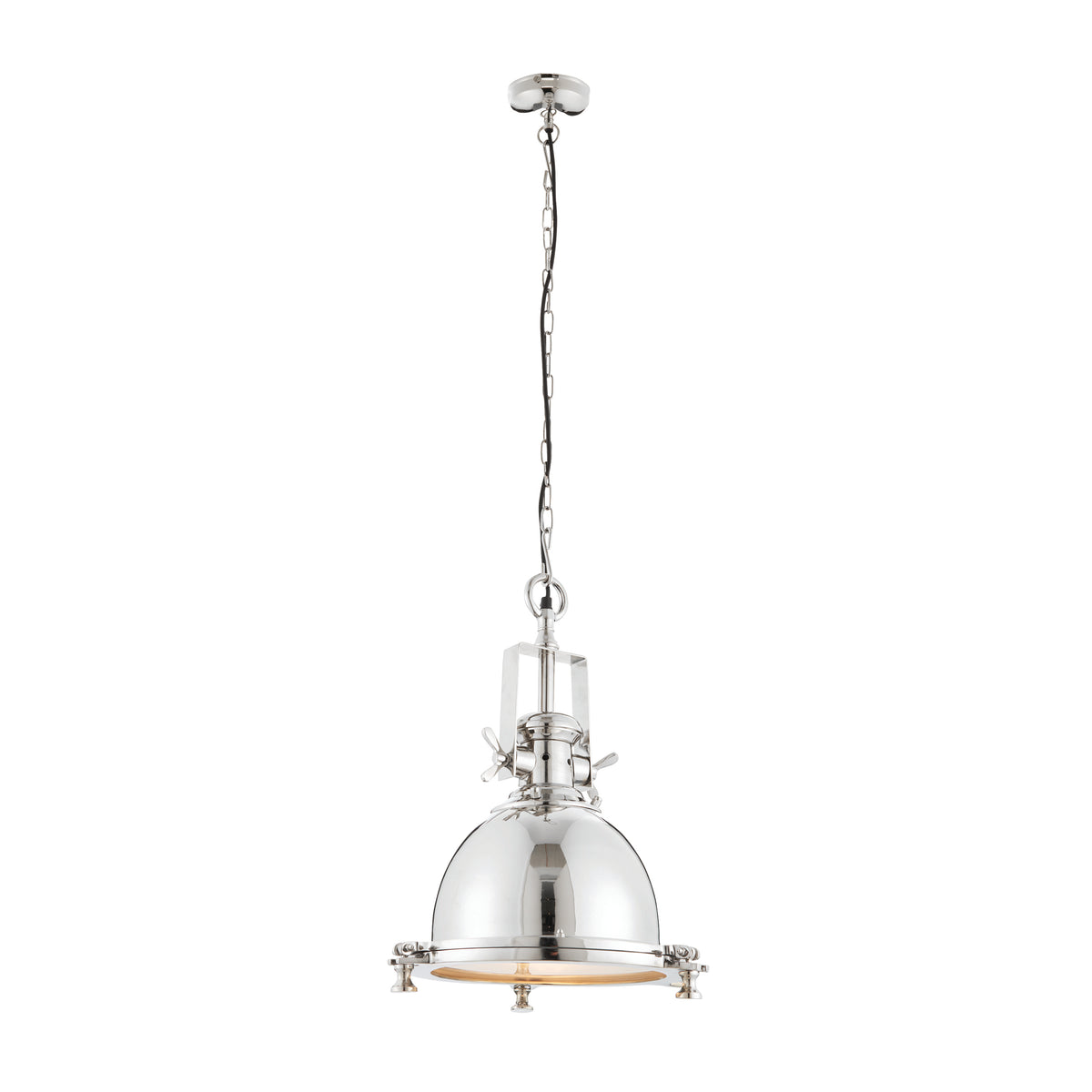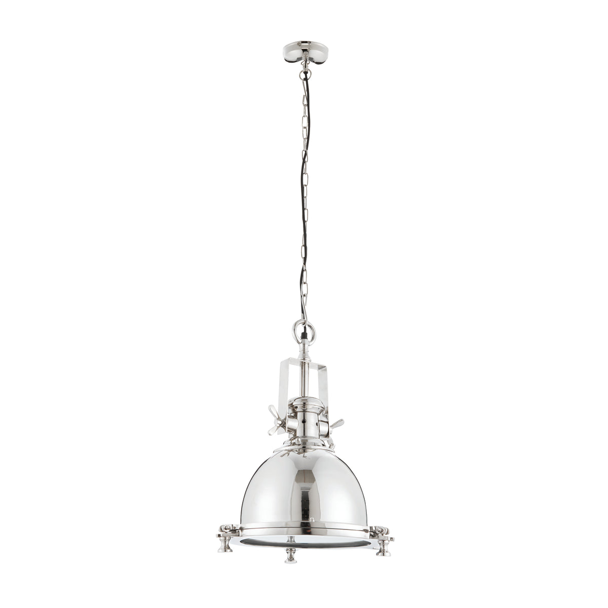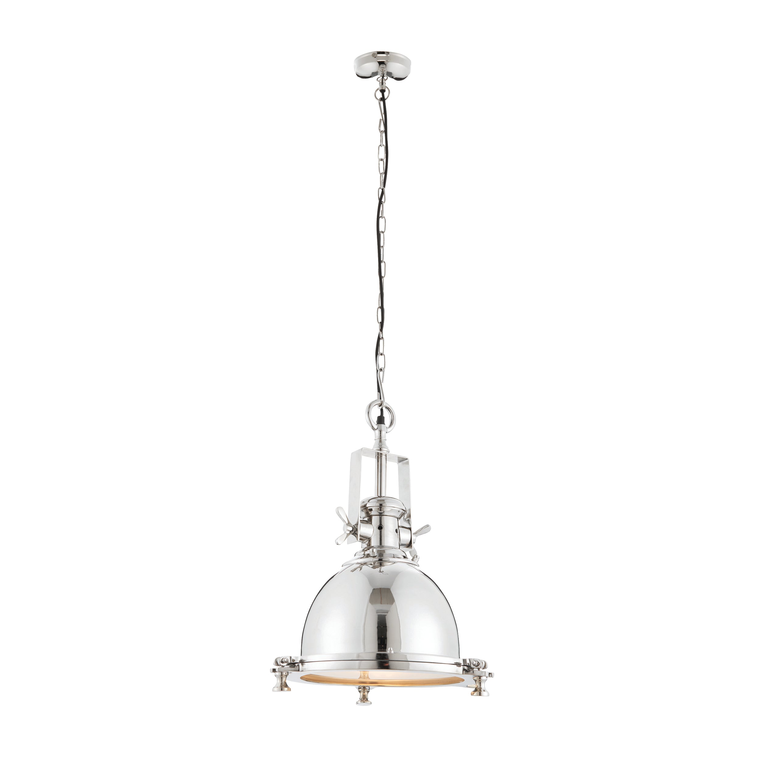 A bold and timeless bright nickel plated pendant light with sandblasted glass diffuser and authentic classic detailing.