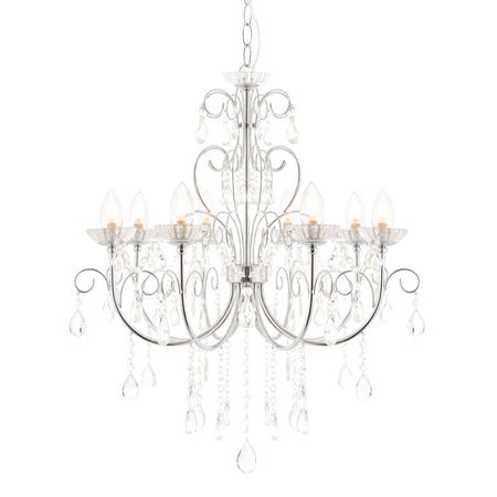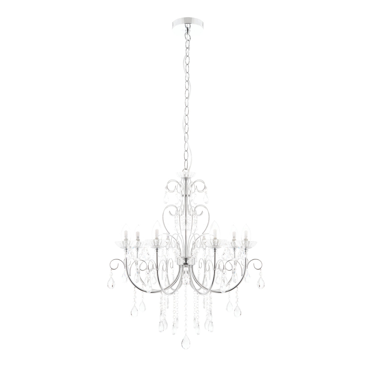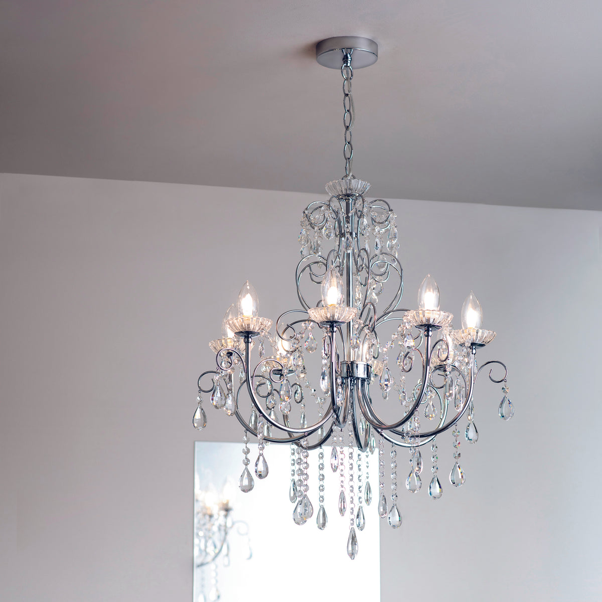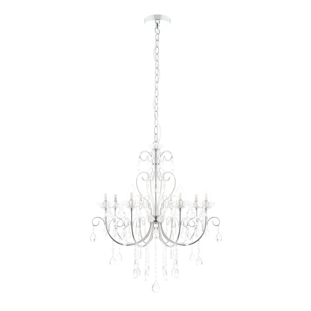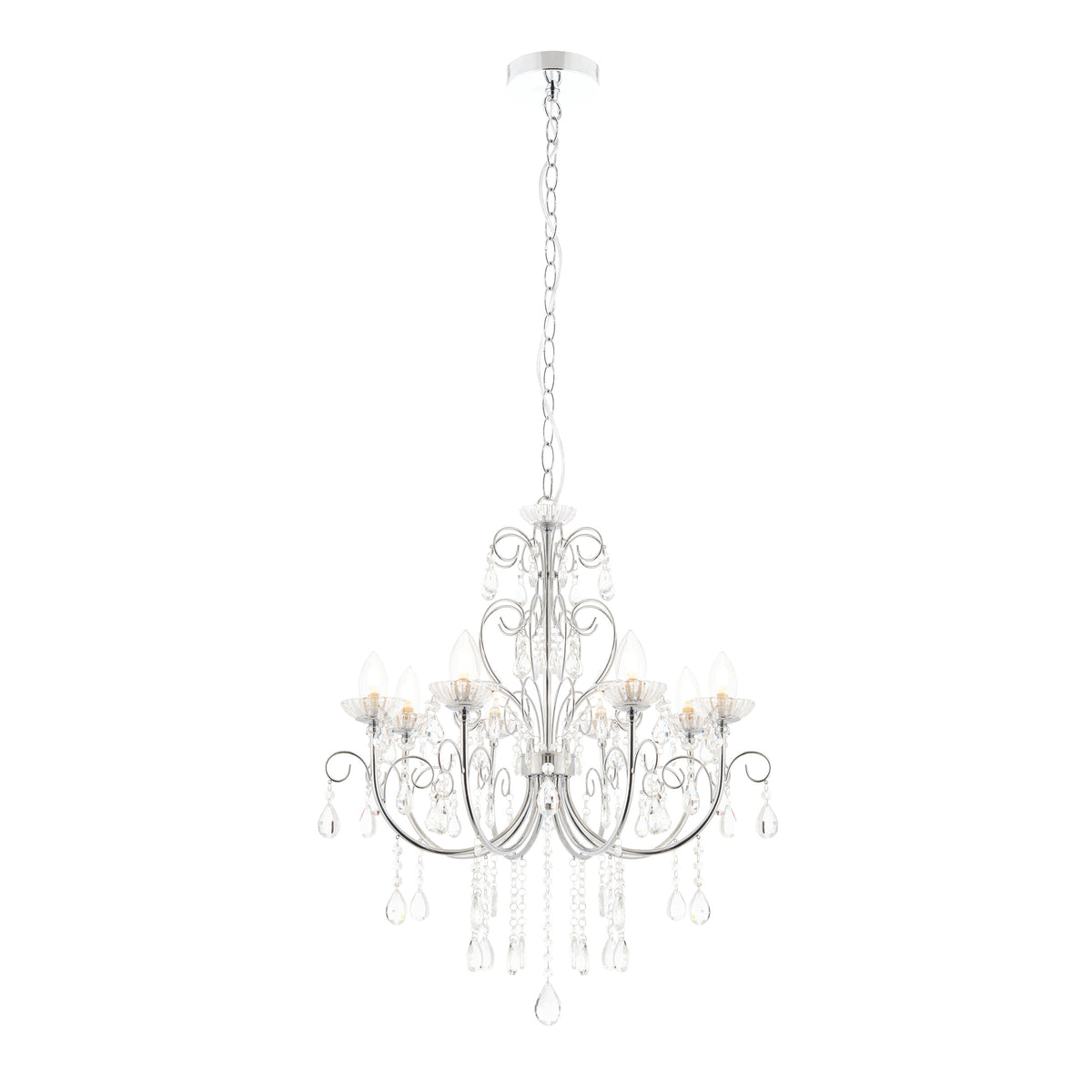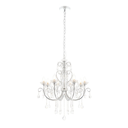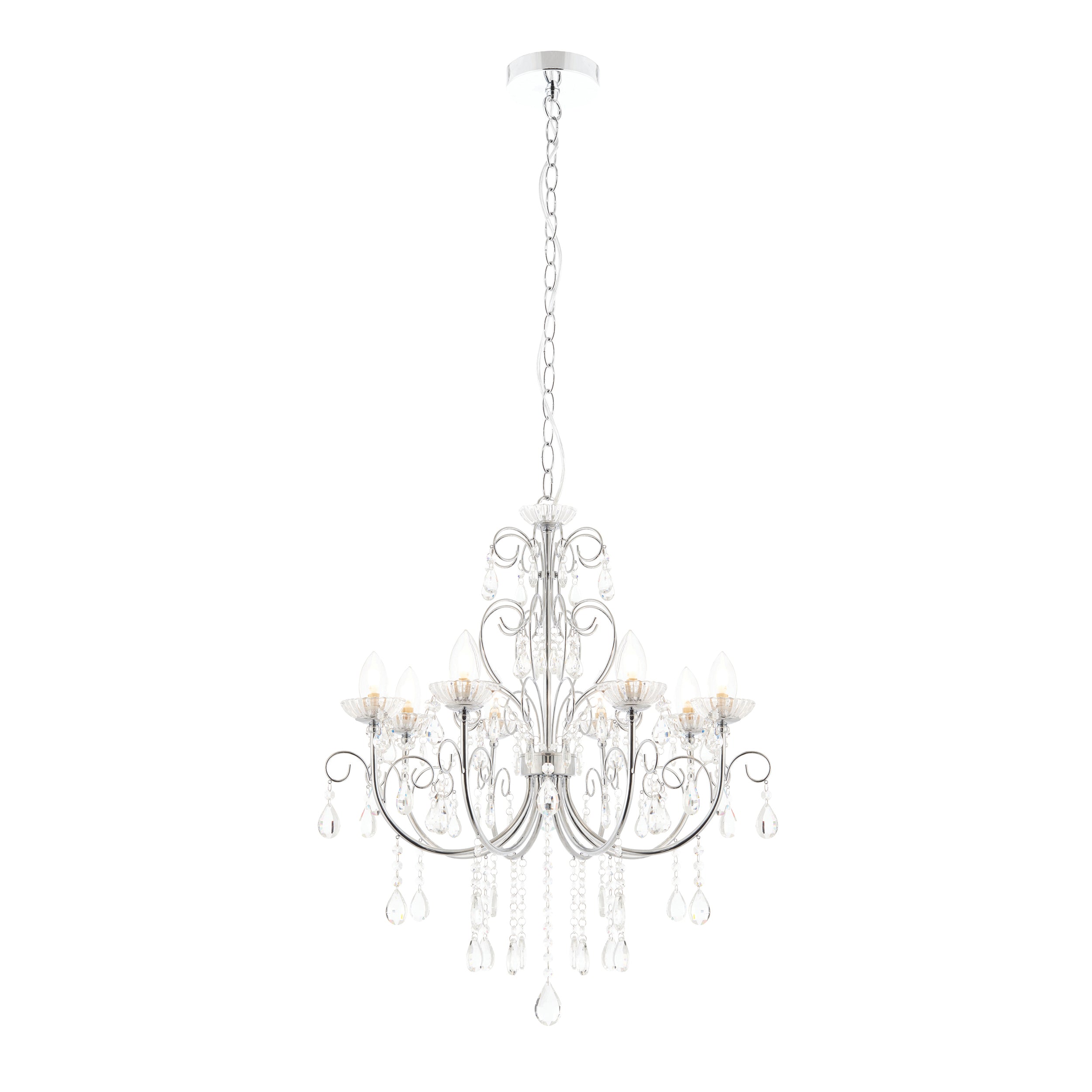 The Tabitha 8 light pendant fitting is finished in a chrome effect plate with clear crystal glass detail and droplets. IP44 rated so suitable for use in the bathroom, dimmable and suitable for use with LED lamps. Matching items available.
