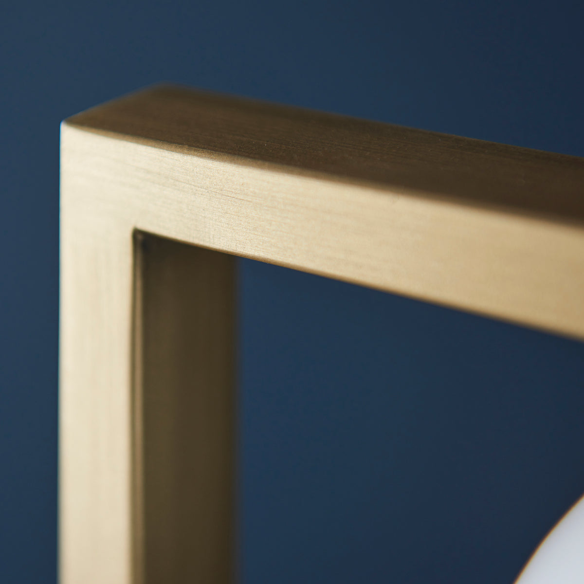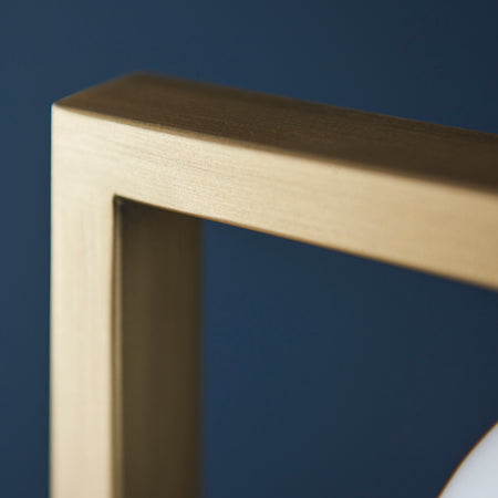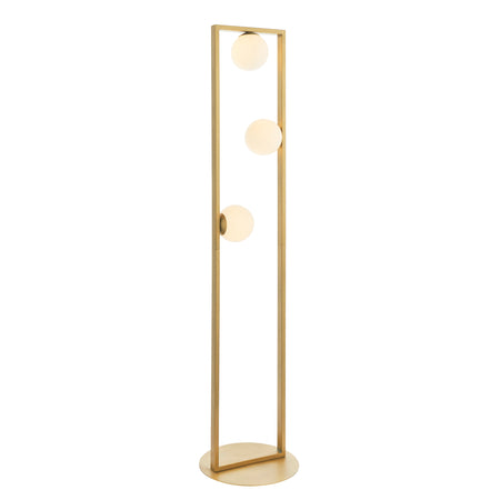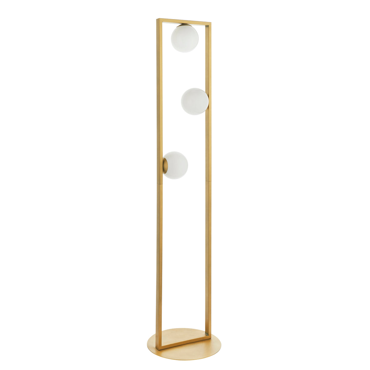This sleek, geometric floor light features an angular, asymmetric brushed gold stand supporting three opal glass spheres creating an atmospheric glow. Combine with the table light from the same range for a coordinated look.