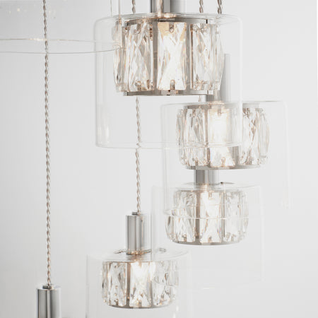High quality clear crystals adorn this deluxe chrome plated multi pendant, the crystal shades are enclosed by beautiful clear glass diffusers, each suspended on height adjustable clear flex. The combination of clear crystals, polished chrome and glass create a luxurious interior decorative pendant light.