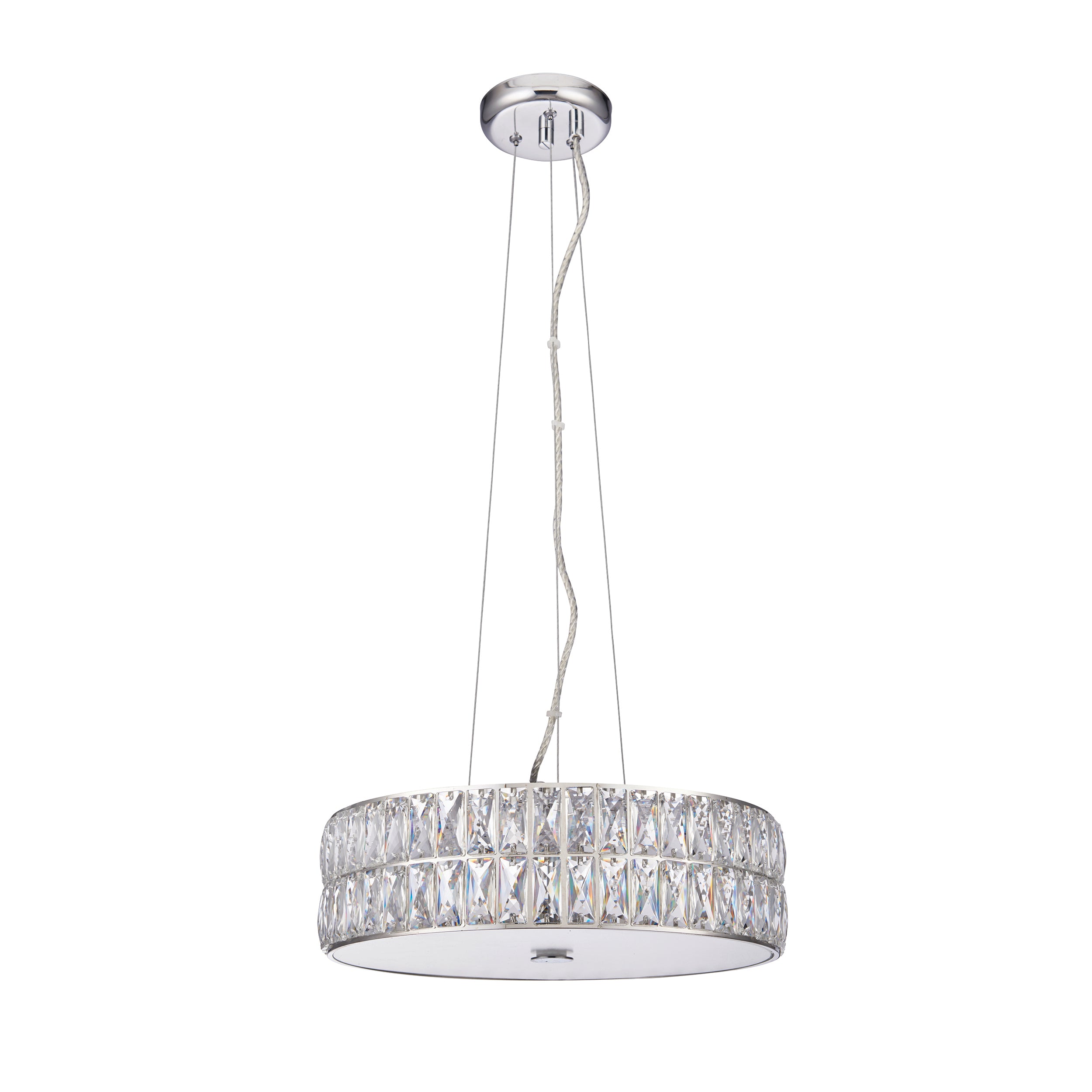 High quality clear crystals adorn this deluxe chrome plated LED contemporary pendant, fully enclosed by a beautiful prismatic glass diffuser. The combination of clear crystals, polished chrome and glass create a luxurious interior decorative light pendant. Suspended from thin wire and clear flex with integrated LED light source for bright light output.
