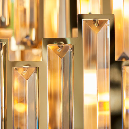 For maximalist drama this magnificent chandelier features cascades of champagne-coloured cut crystal lozenges. This jewel-like centrepiece creates the perfect luxe look. Available in a twelve and fifteen light.