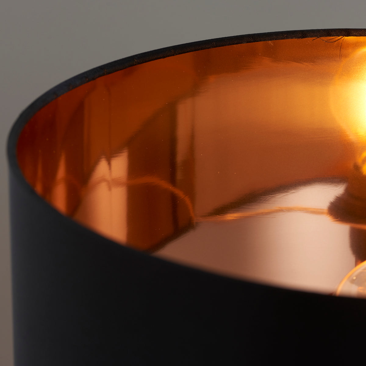 • Black fabric shade lined with a metallic copper inner