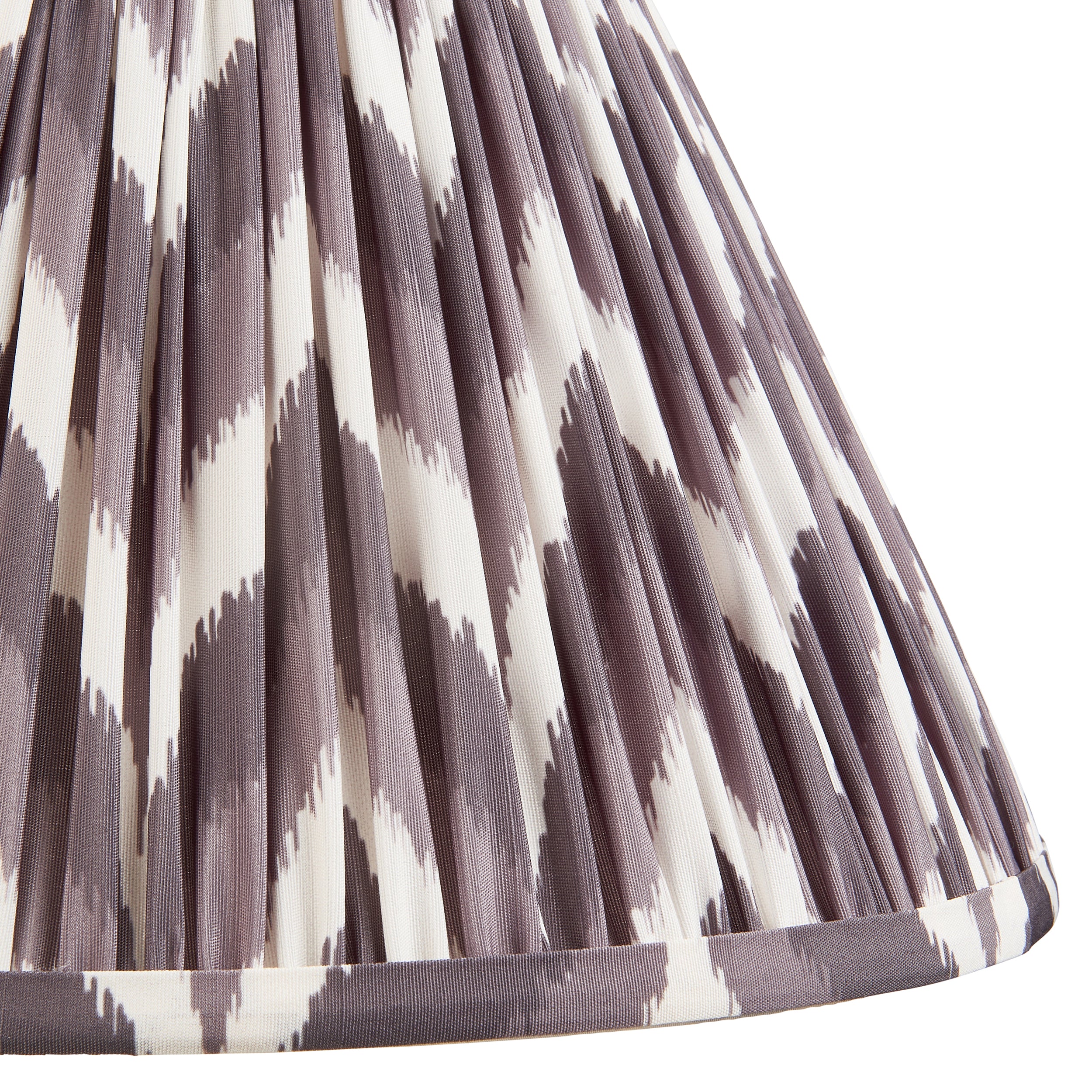 30cm tapered shade with white gimbal. Zigzag pattern in pearl grey colour with taped edge detailing and plain inner lining. Perfect when paired with one of our beautifully decorative table lights.
