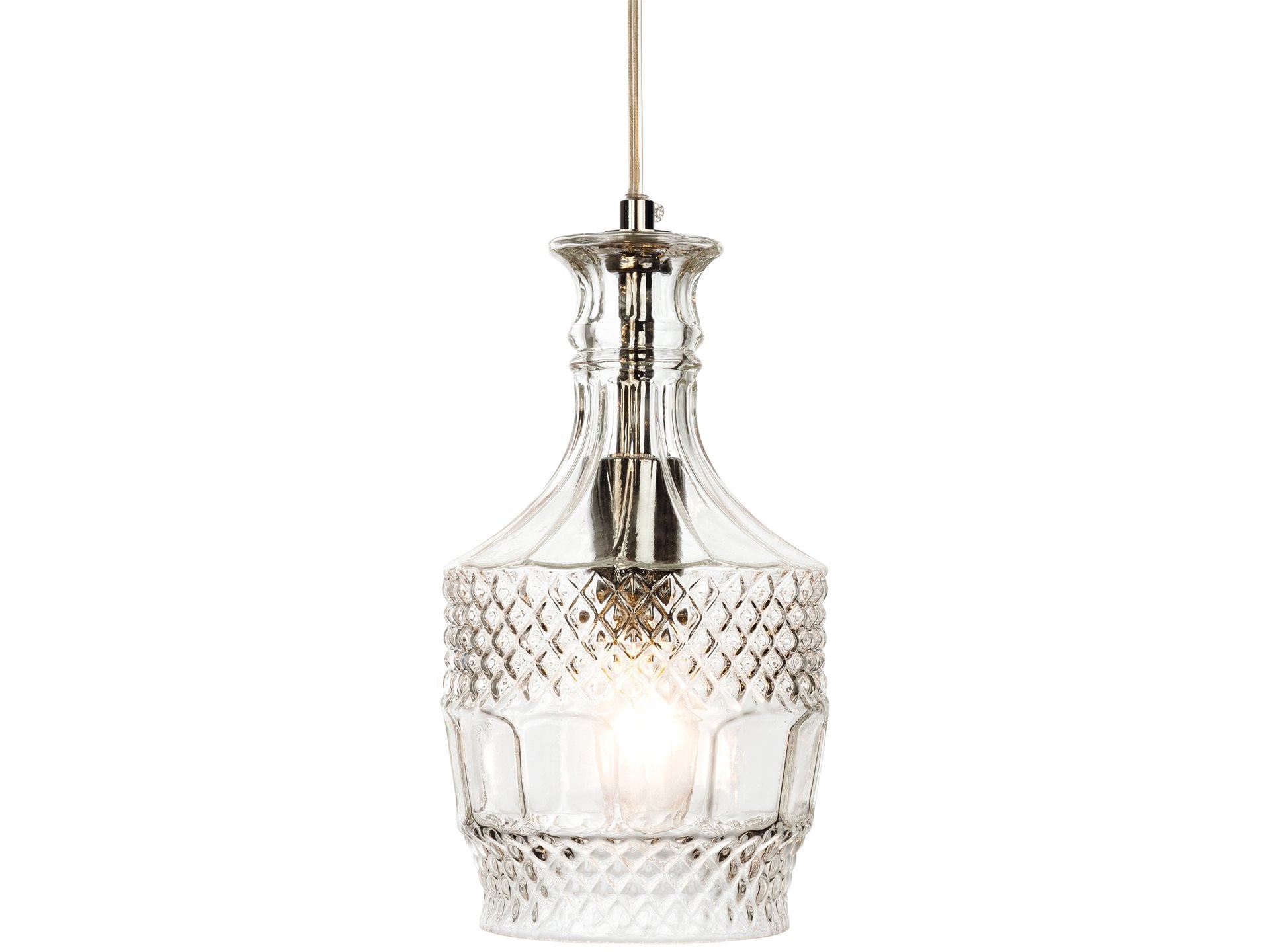Uniquely designed around a drinks decanter this clear cut glass style pendant has chrome metalwork and clear cable.