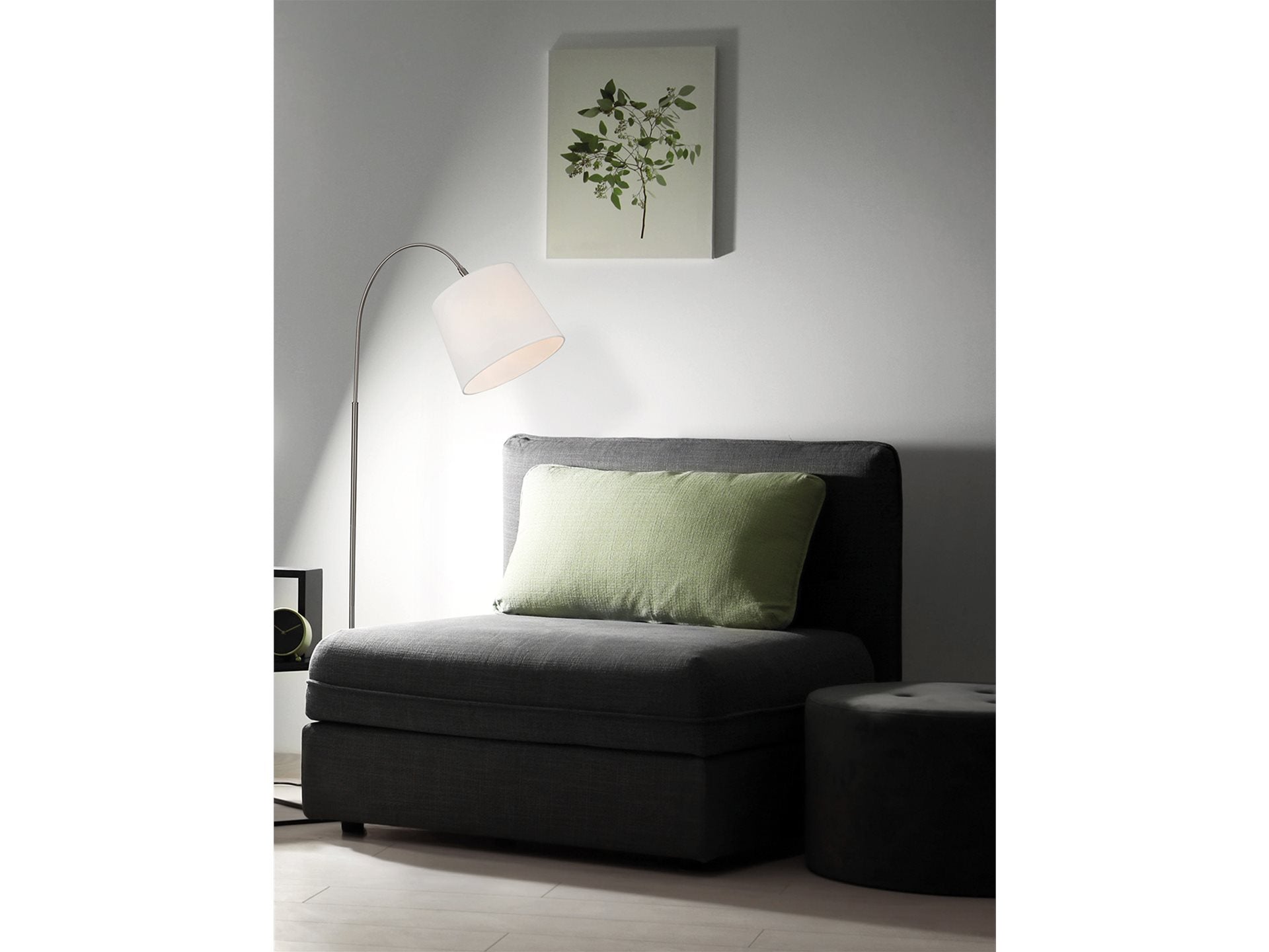 A simple but elegant floor lamp that is ideal for use where light is desired over a sofa or chair arm for reading. Modern brushed steel finish, cream shade and an on/off foot switch for convenience.