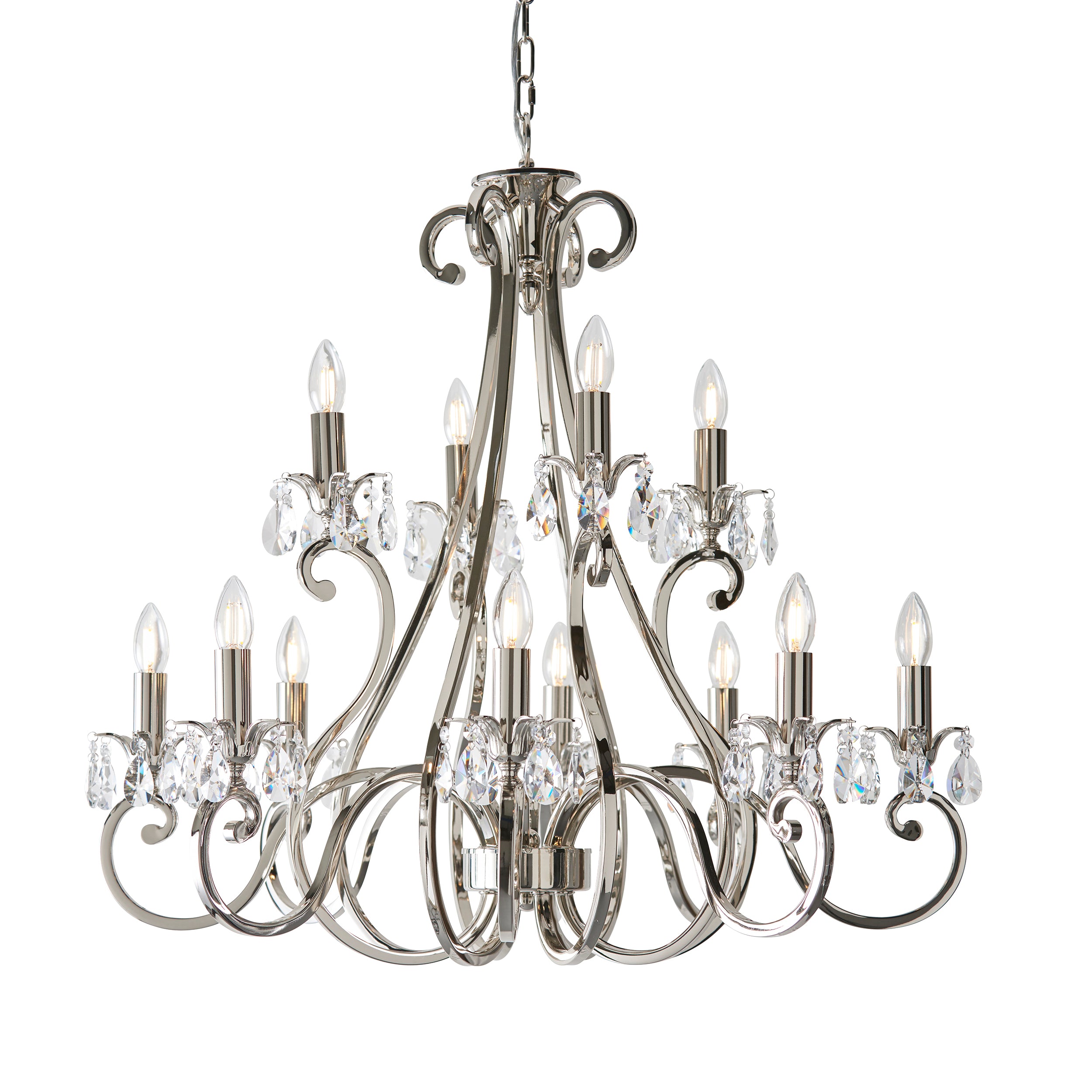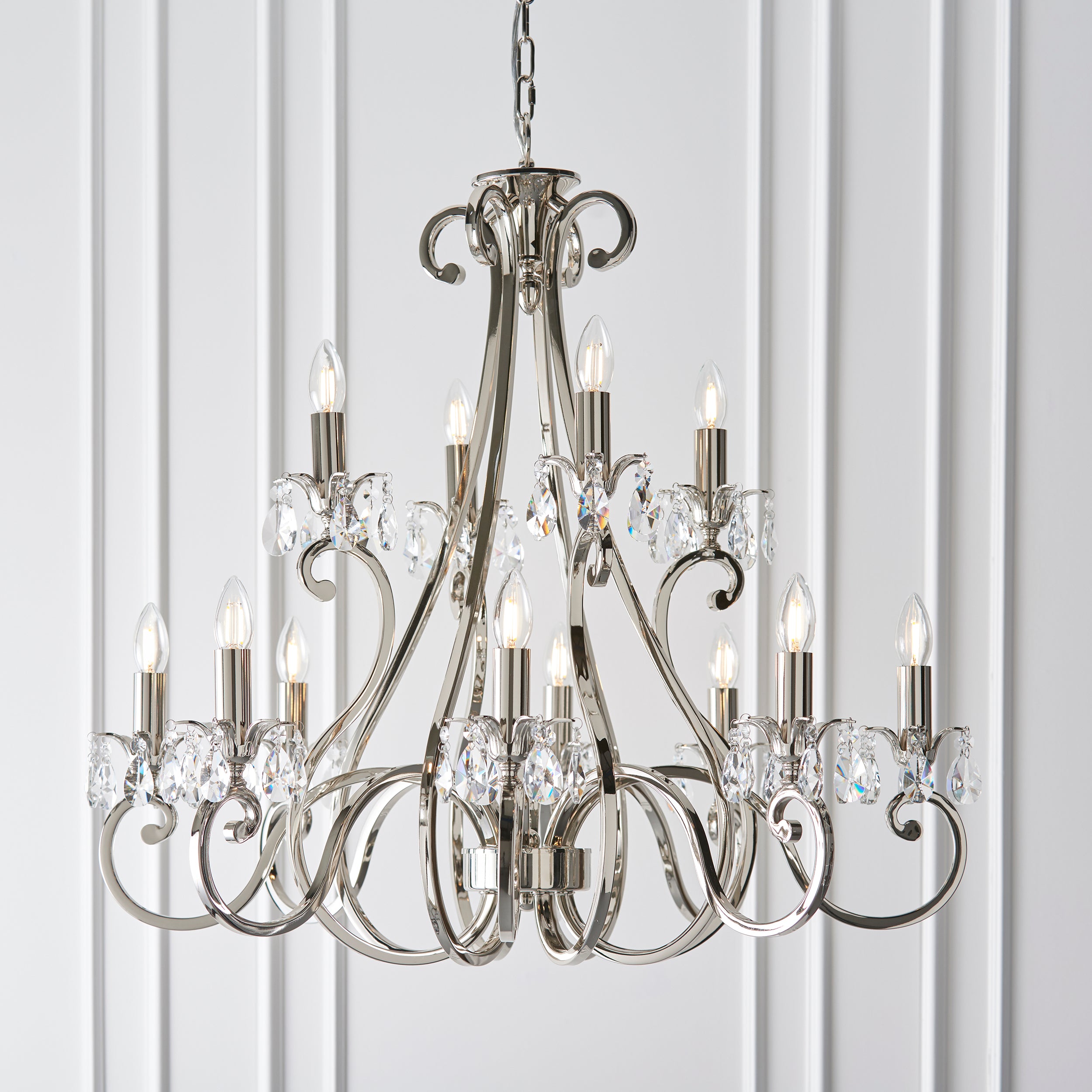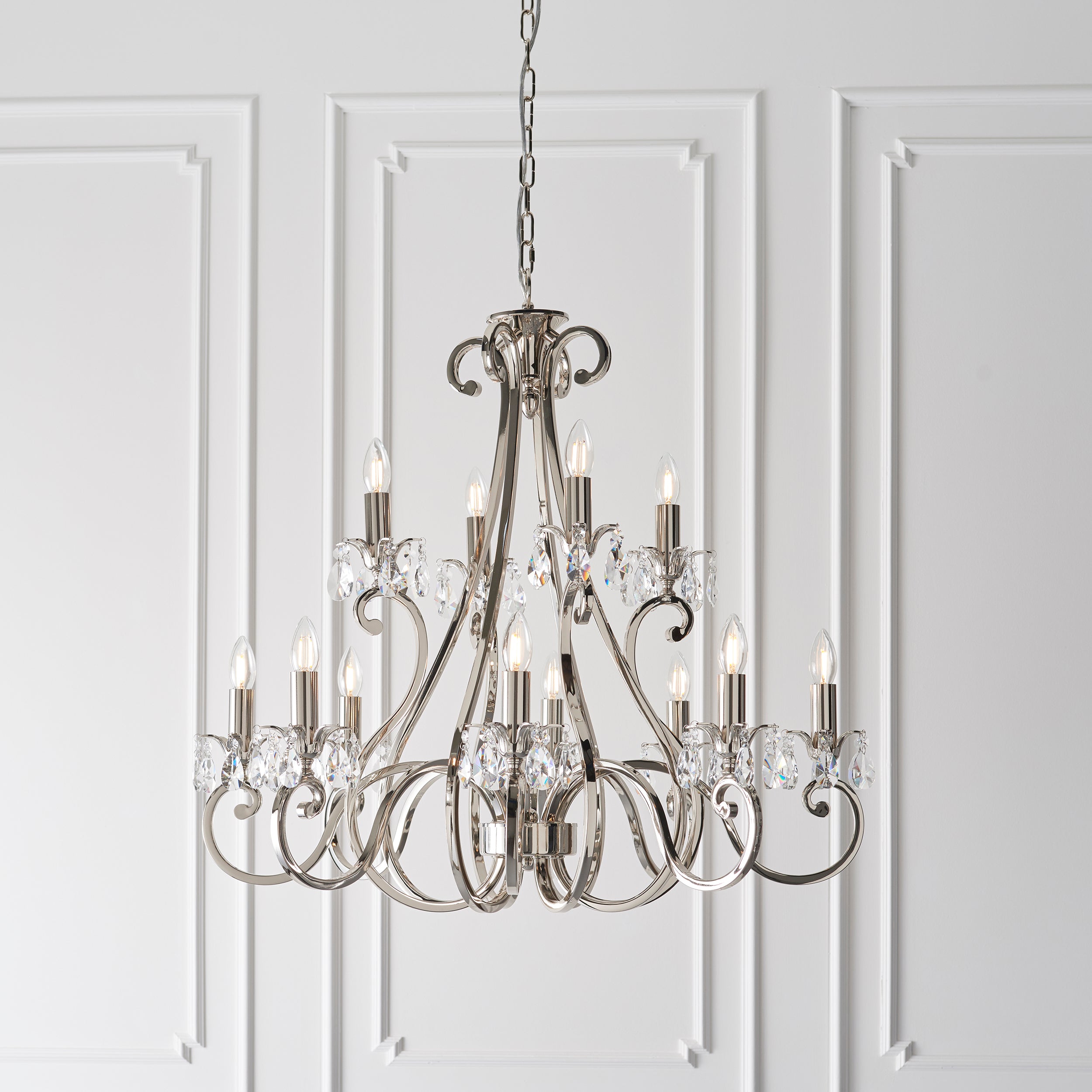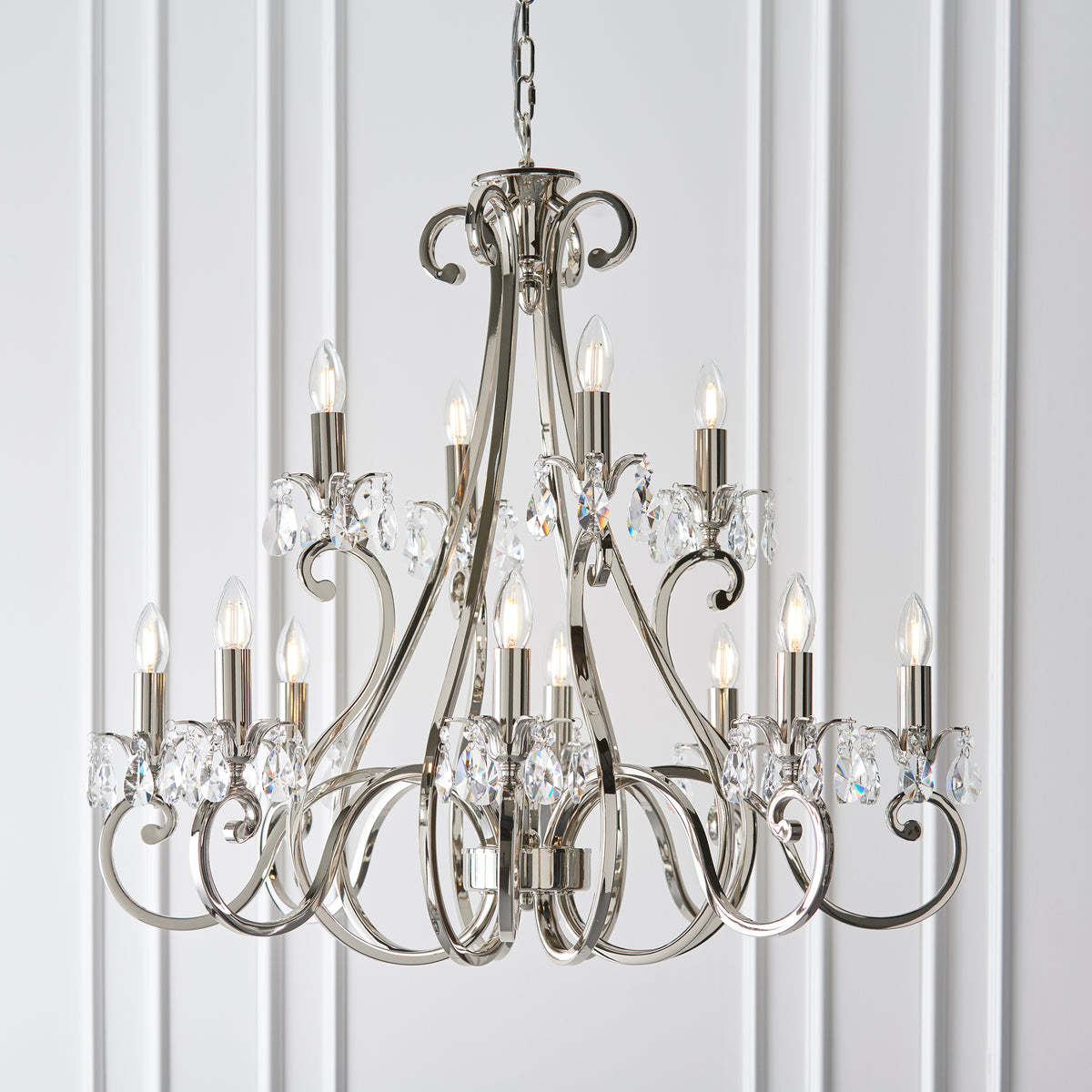 A 12 light pendant from the Oksana nickel range. Features faceted lead crystal droplets around the lamp holder on each decorative arm. Matching items available and compatible with LED lamps