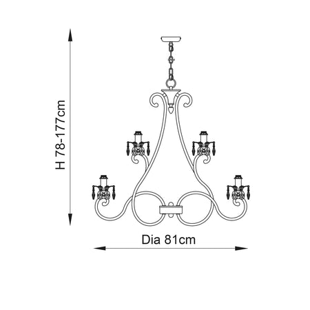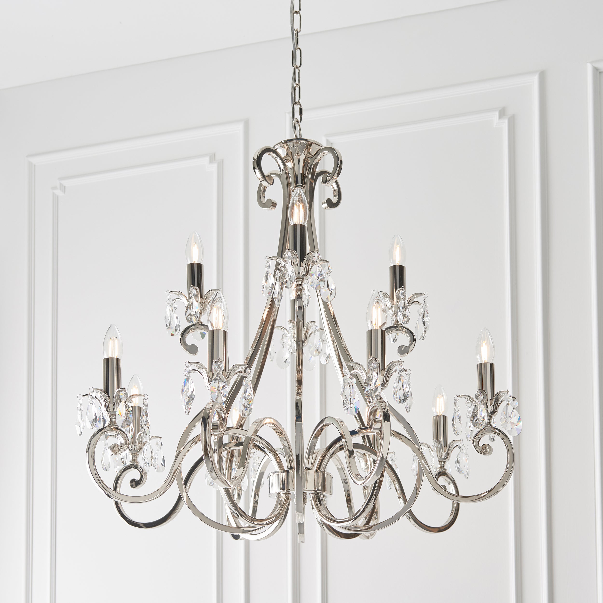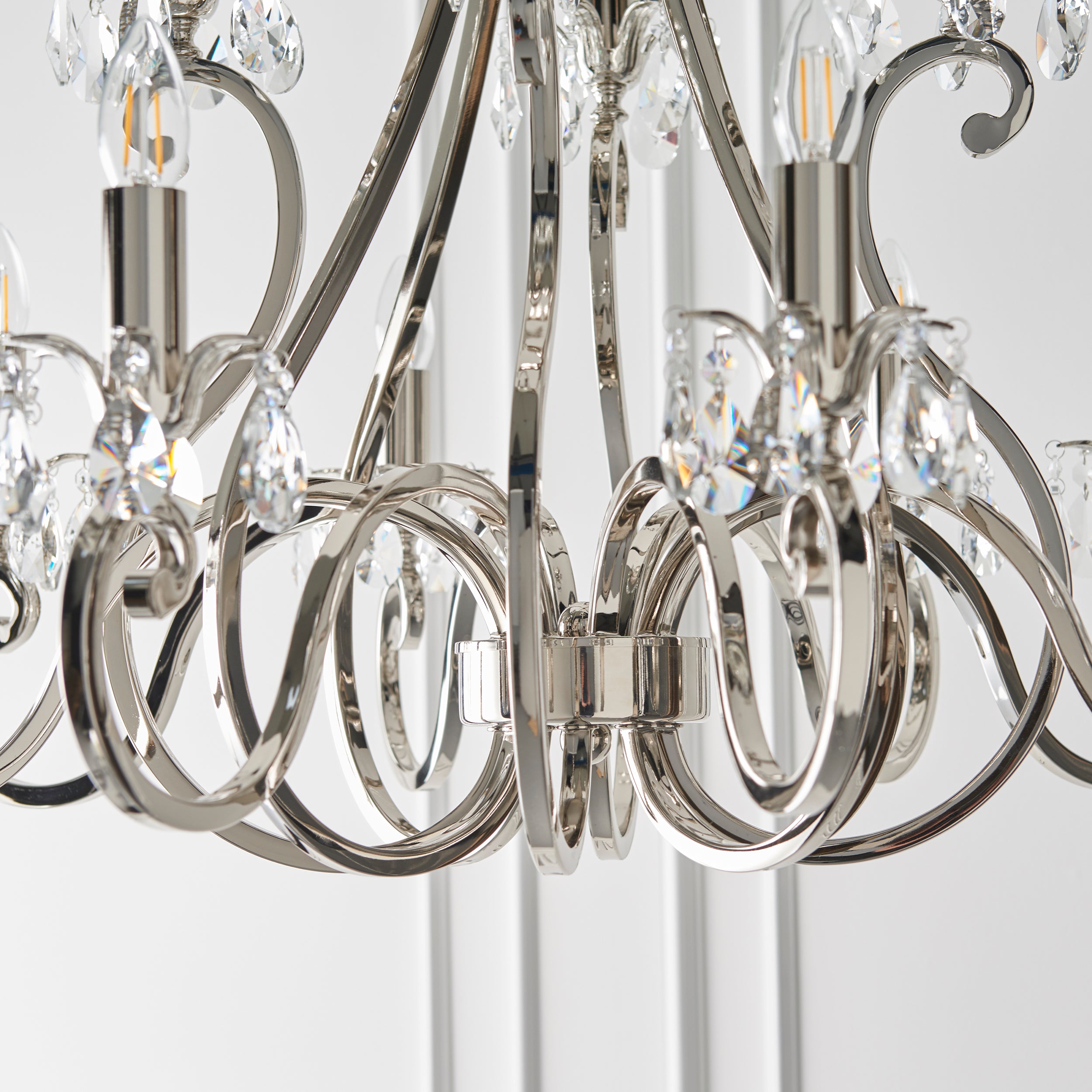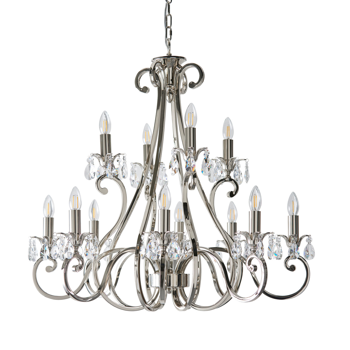 A 12 light pendant from the Oksana nickel range. Features faceted lead crystal droplets around the lamp holder on each decorative arm. Matching items available and compatible with LED lamps