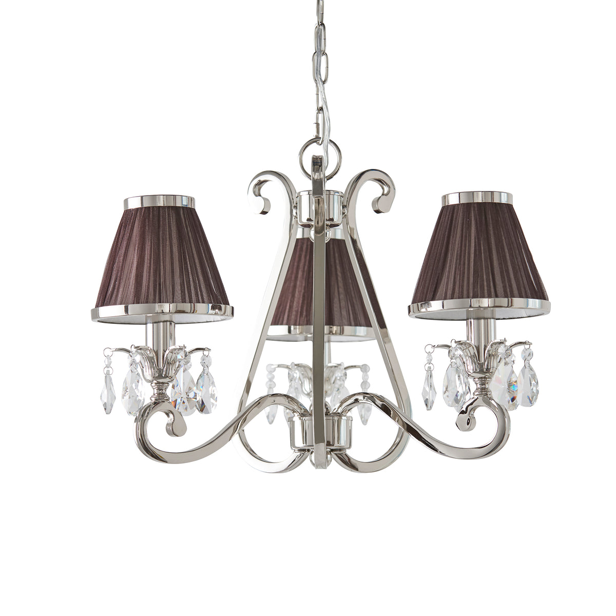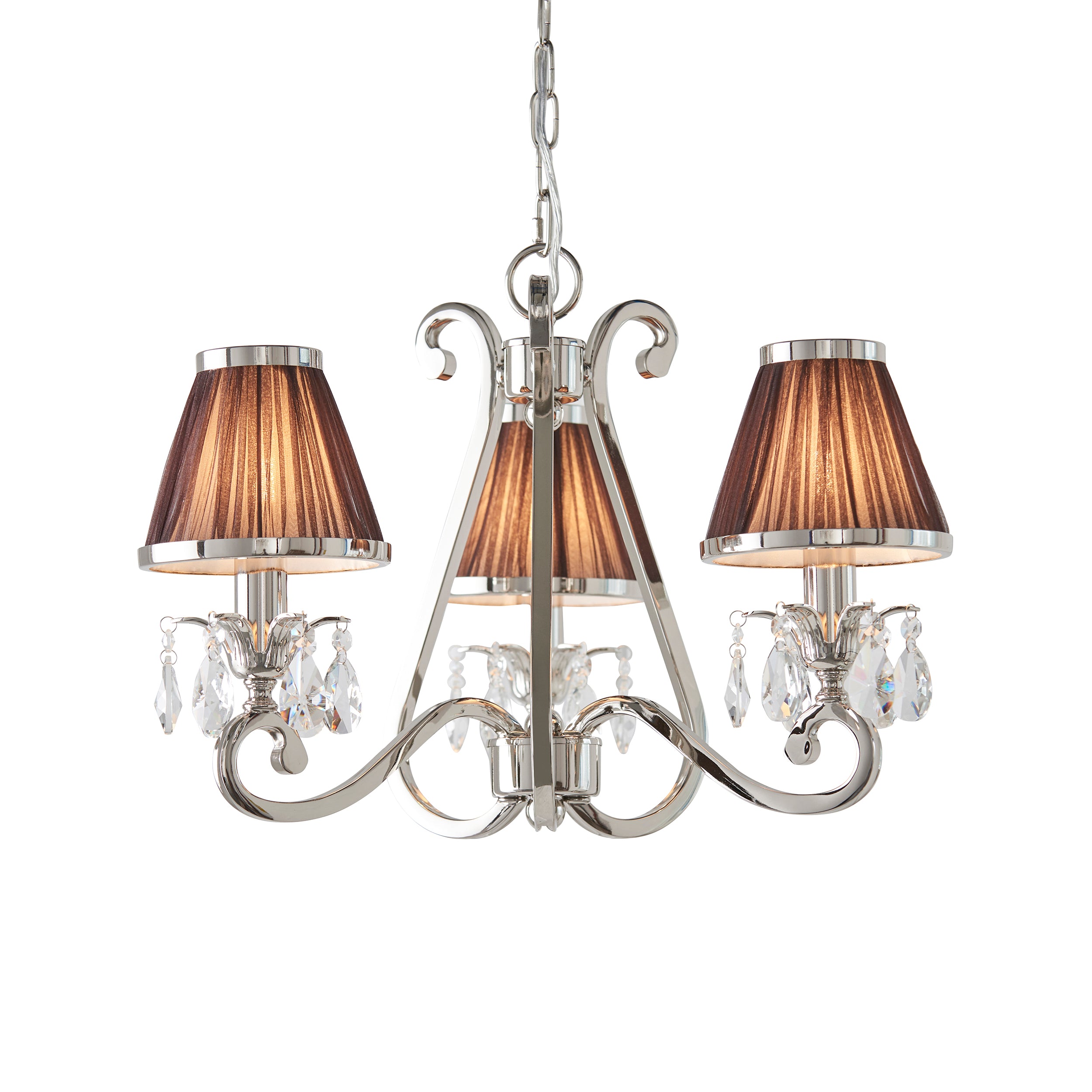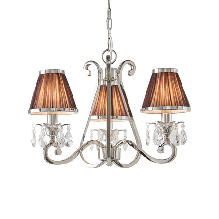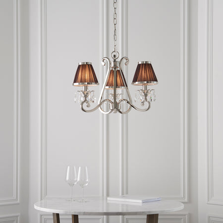 A 3 light pendant from the Oksana nickel range. Features faceted lead crystal droplets and chocolate pleated shades with a polished nickel trim. Matching items available and compatible with LED lamps