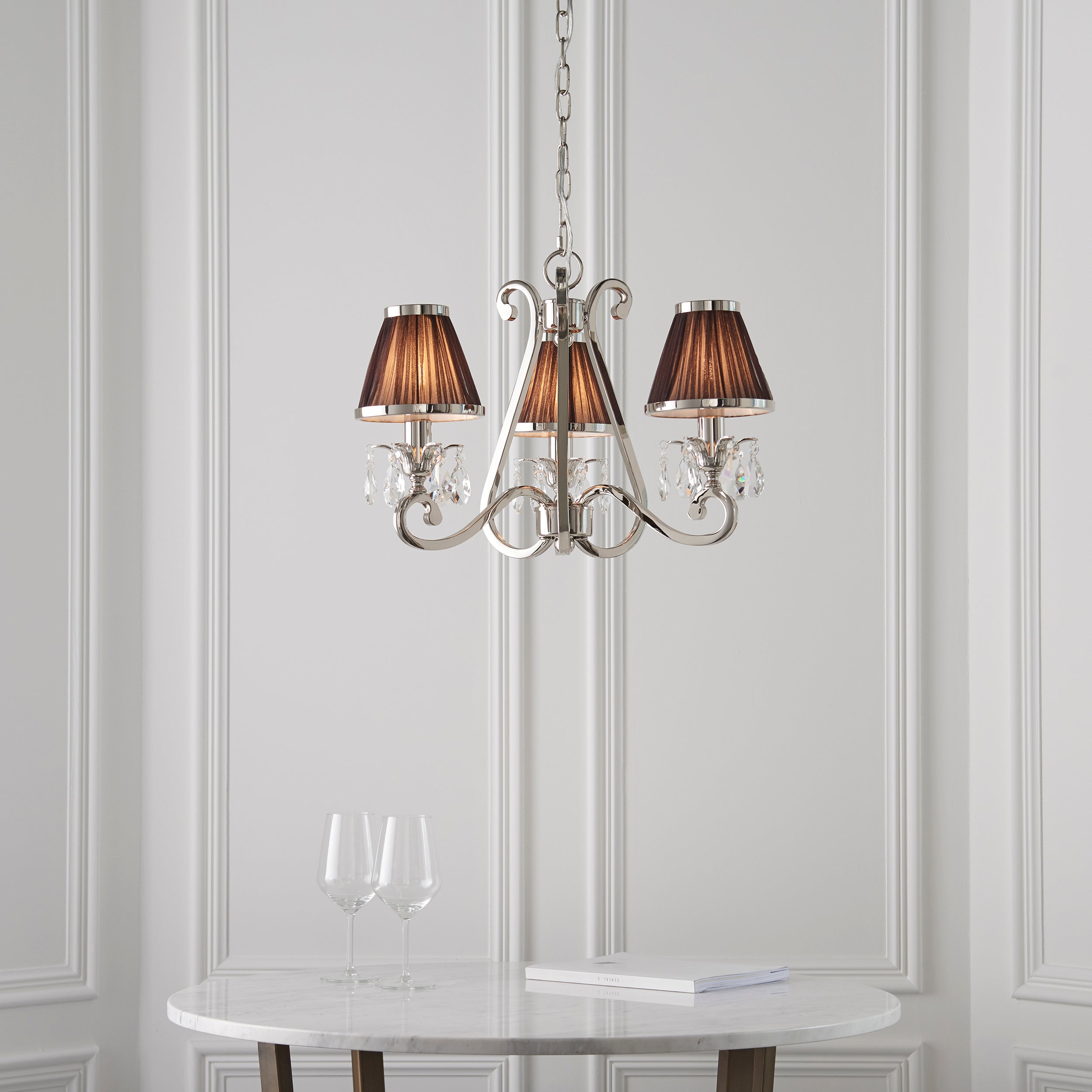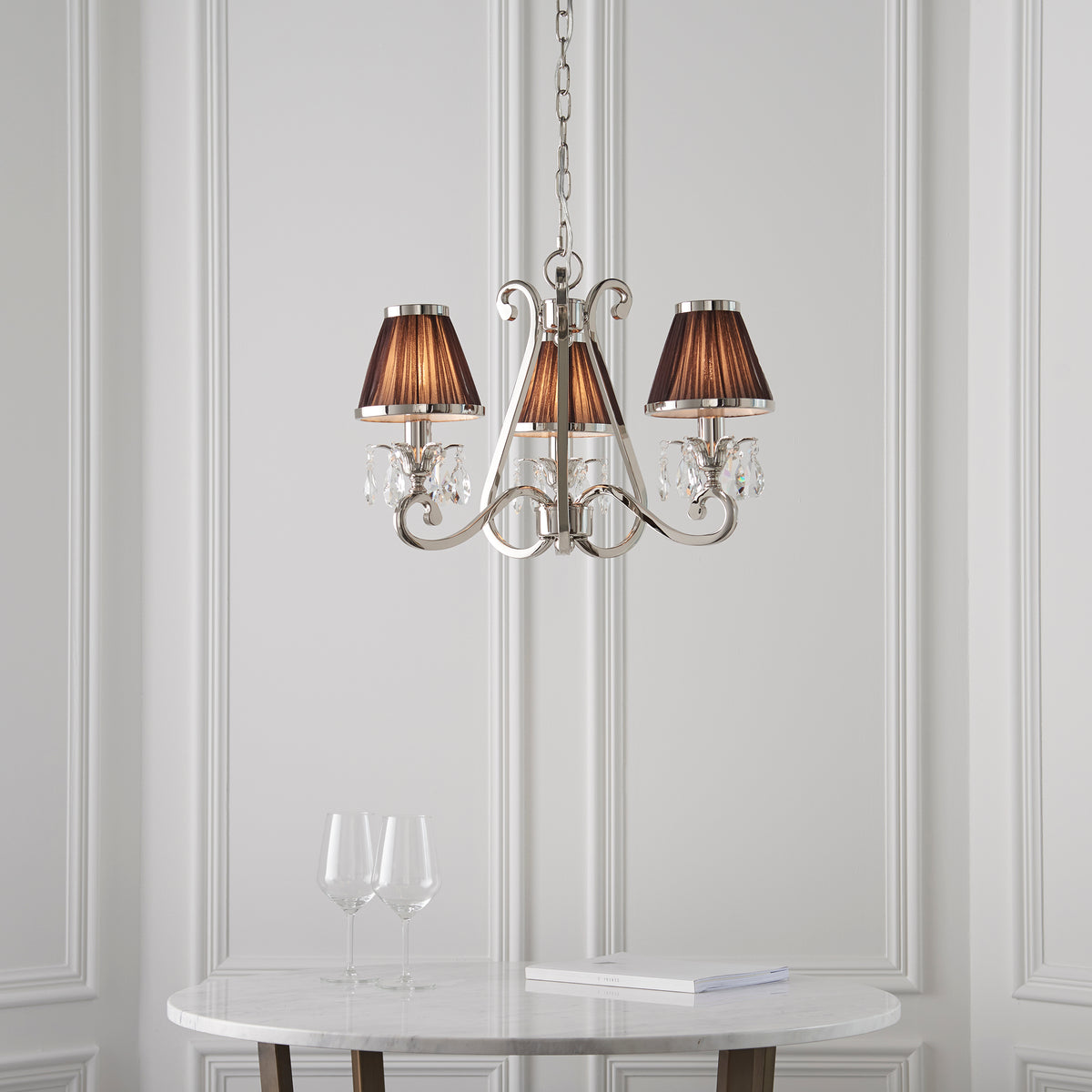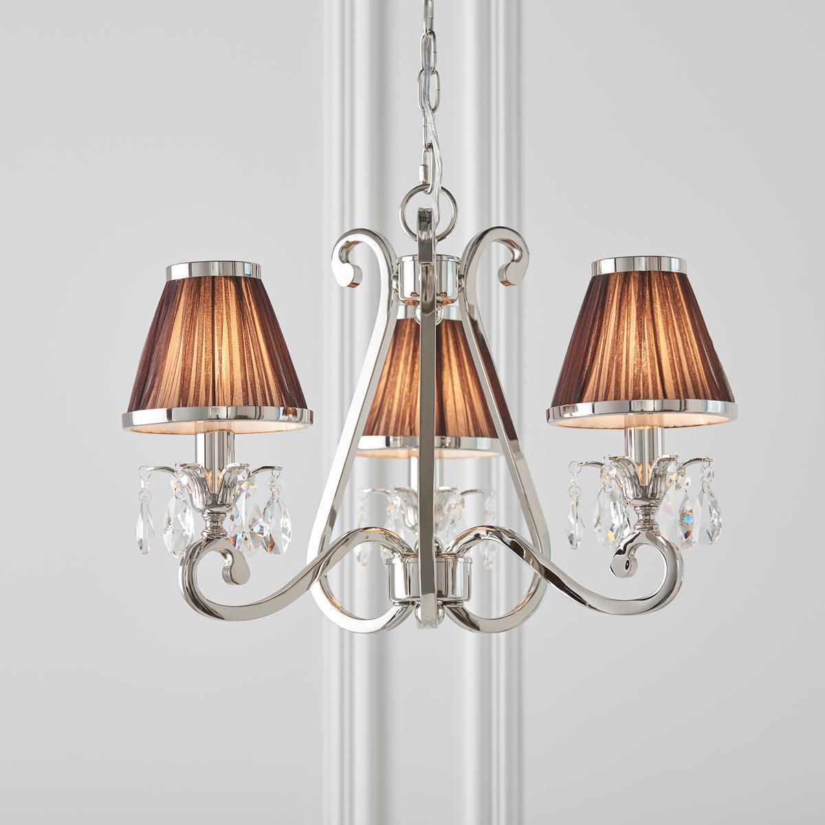 A 3 light pendant from the Oksana nickel range. Features faceted lead crystal droplets and chocolate pleated shades with a polished nickel trim. Matching items available and compatible with LED lamps