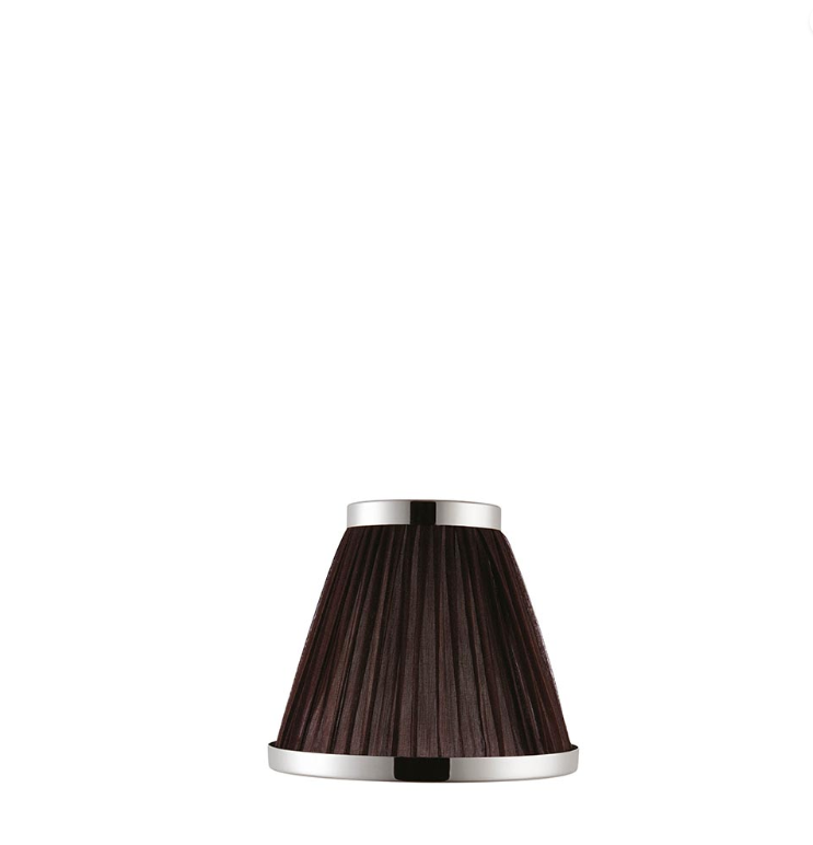 This 6 inch Suffolk shade is crafted from a chocolate pleated organza effect fabric, with a polished nickel trim