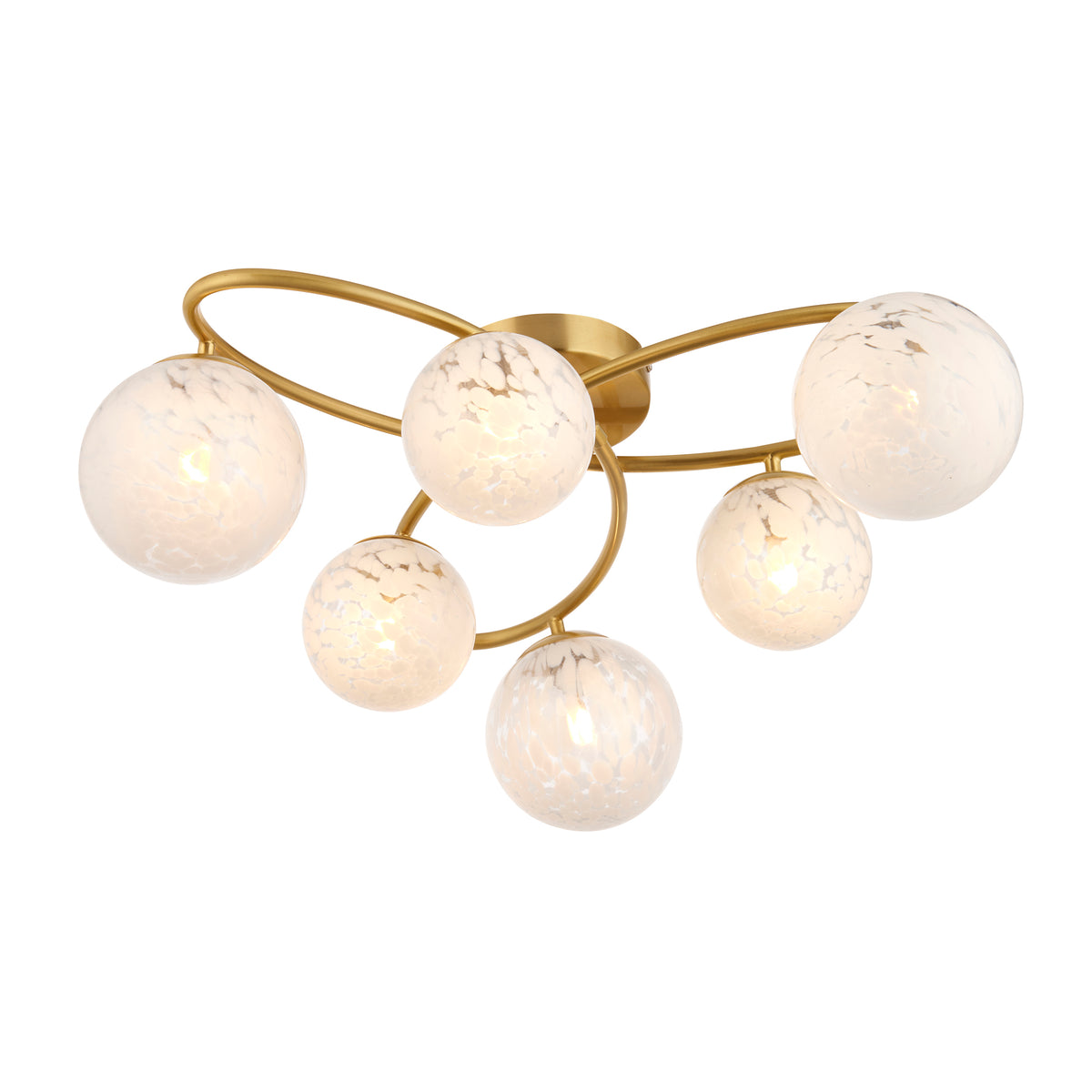 Ideal for adding a simple yet decorative statement to a low ceiling; soft confetti swirls allow the light to elegantly disperse from satin brass plate looped arms. Also available as a 3 light semi flush.