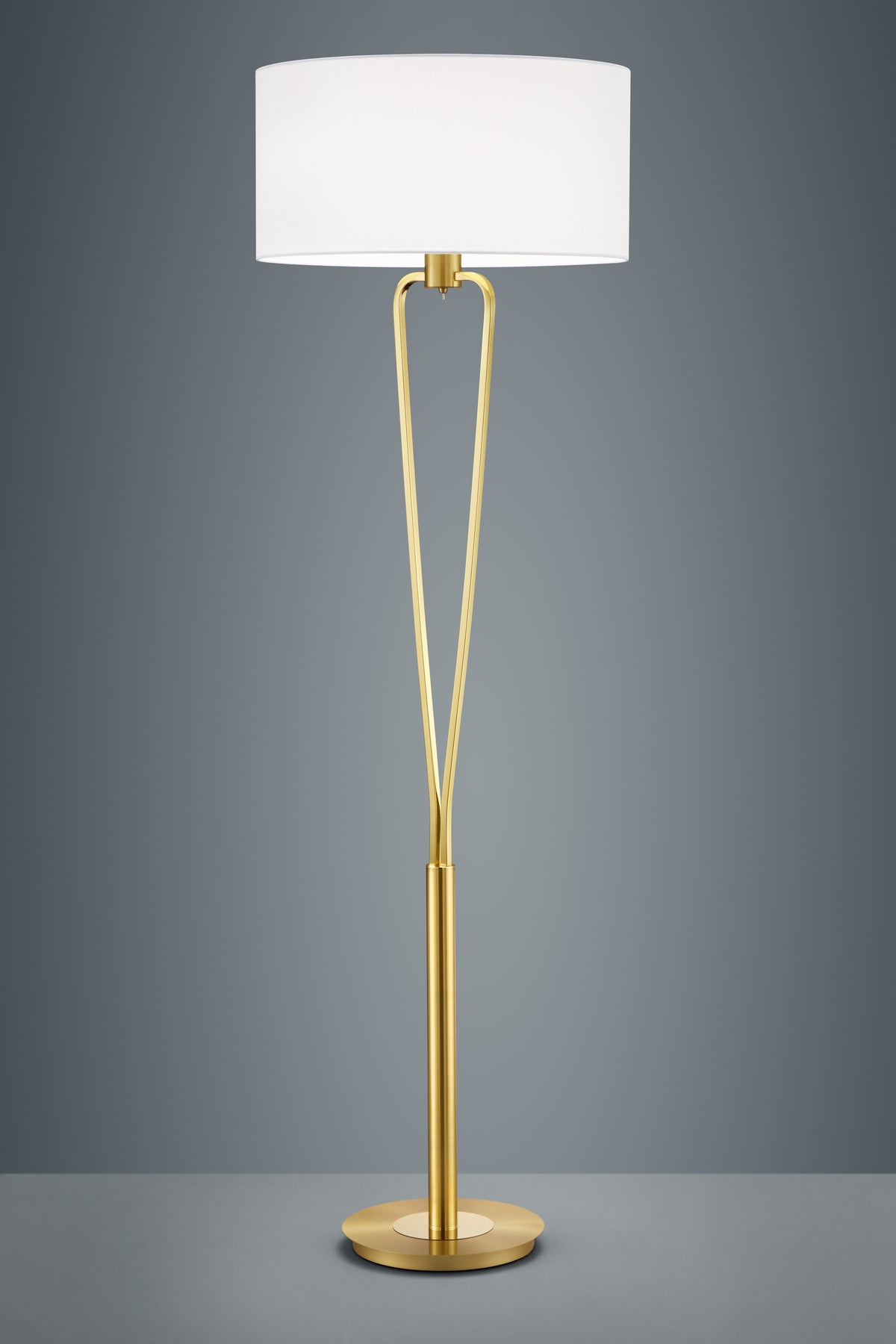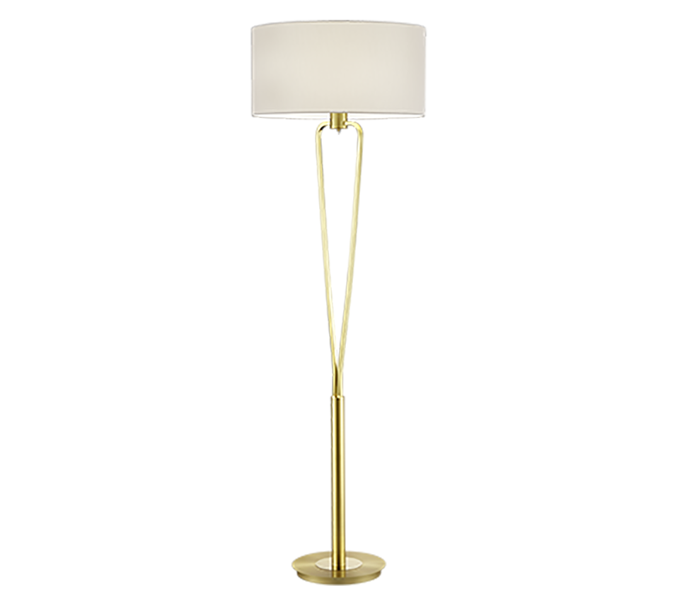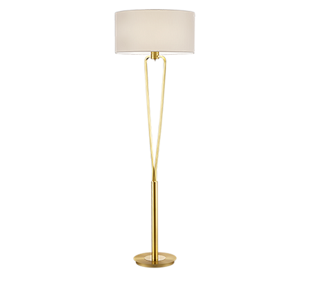 The matt brass base is combined with a white shade made of elegant fabric. The use of LED light sources is recommended for energy-saving lighting.
