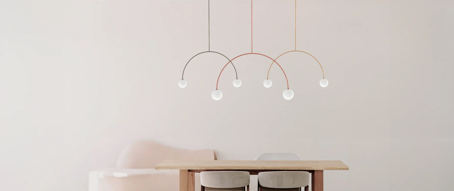 Modern pendant light with gold arch and white spherical shades on a white background