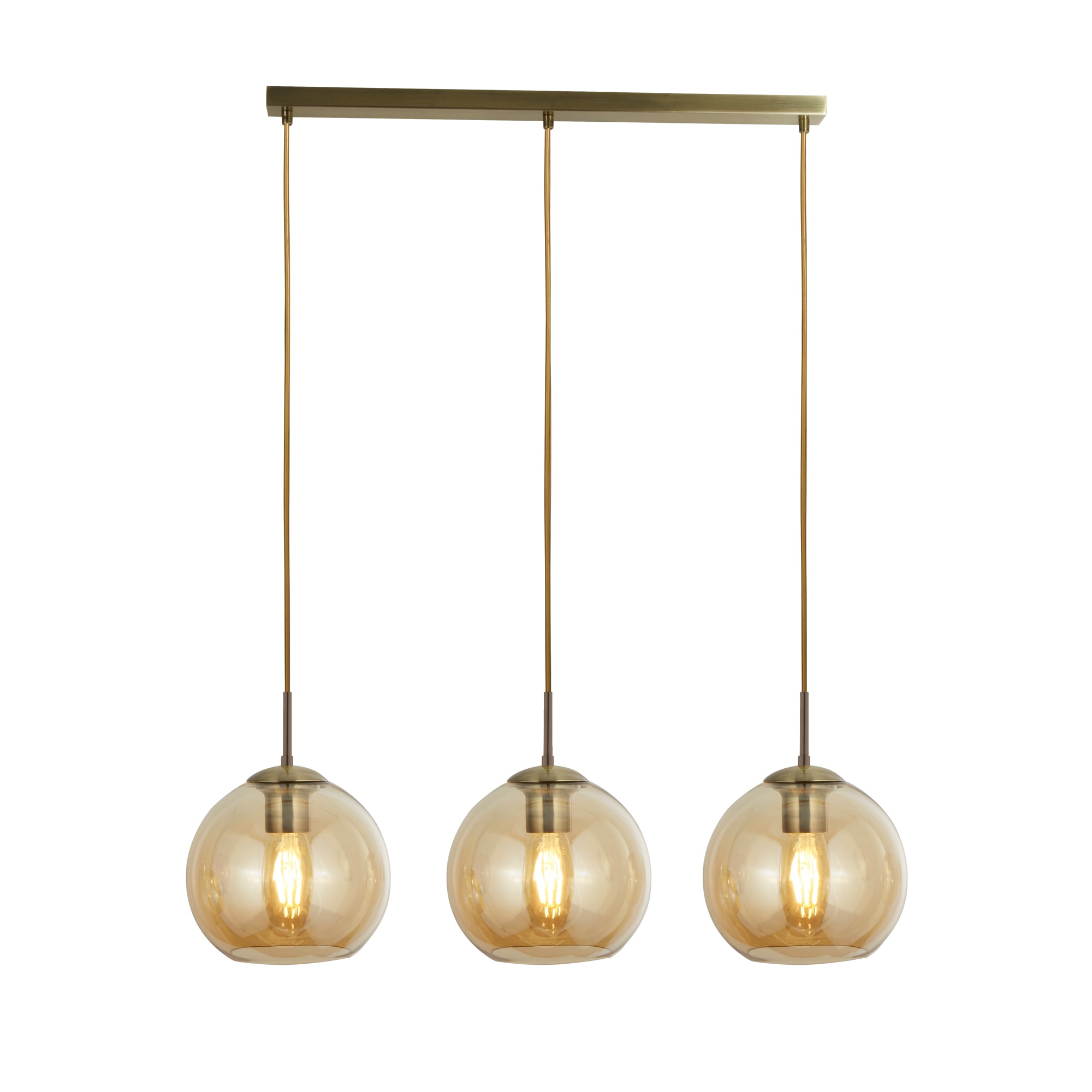 Antique Brass Metal & Amber Glass: Revamp your living space with our 3 light Balls bar pendant in an antique brass finish and amber glass shades. The glass ball shades make this a distinctive product to hang in your kitchen area whether it's above a kitchen island or a dining room table.