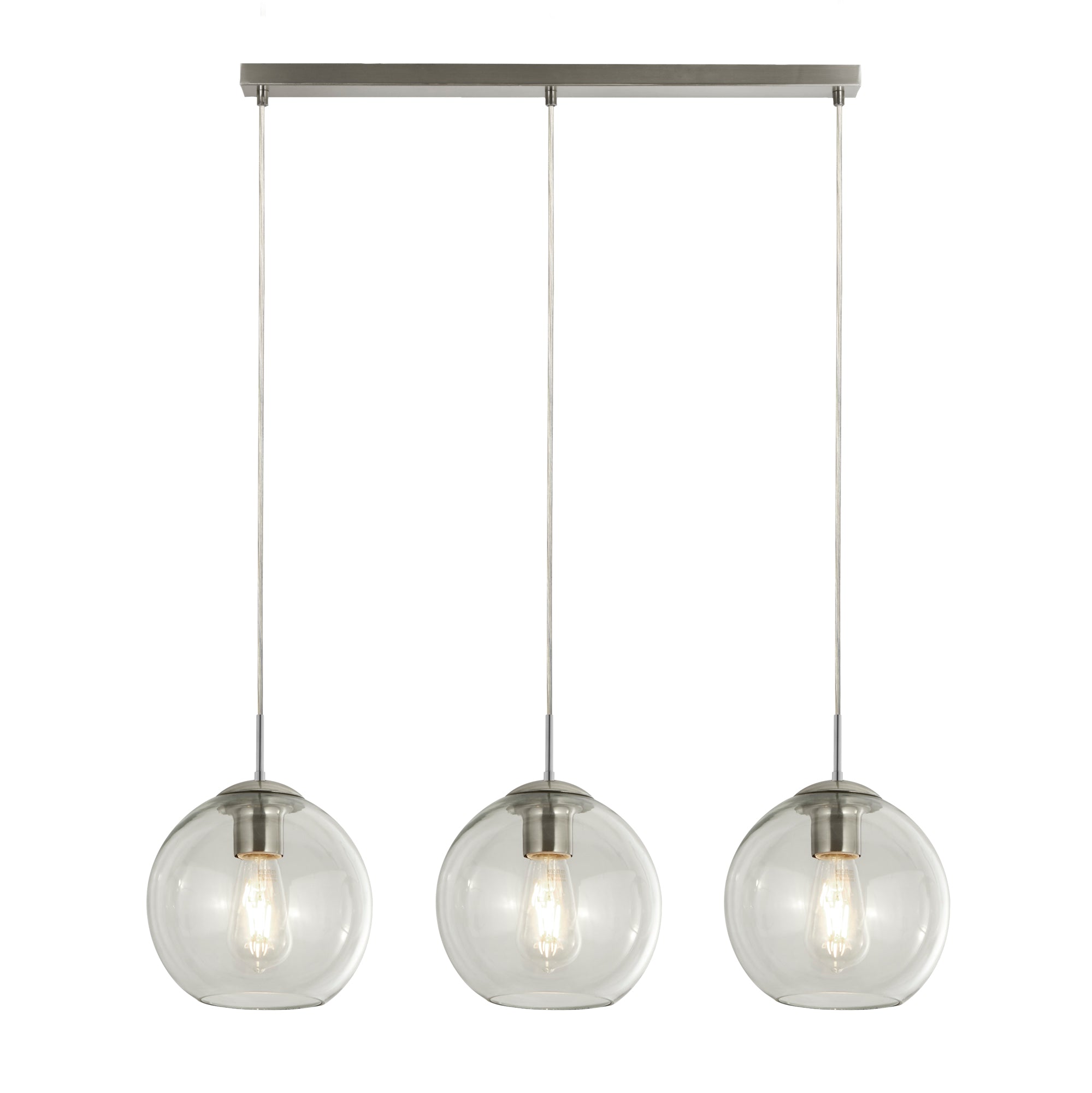 Chrome Metal & Clear Glass: Revamp your living space with our 3 light Balls bar pendant in a chrome finish and clear glass shades. The glass ball shades make this a distinctive product to hang in your kitchen area whether it's above a kitchen island or a dining room table.
