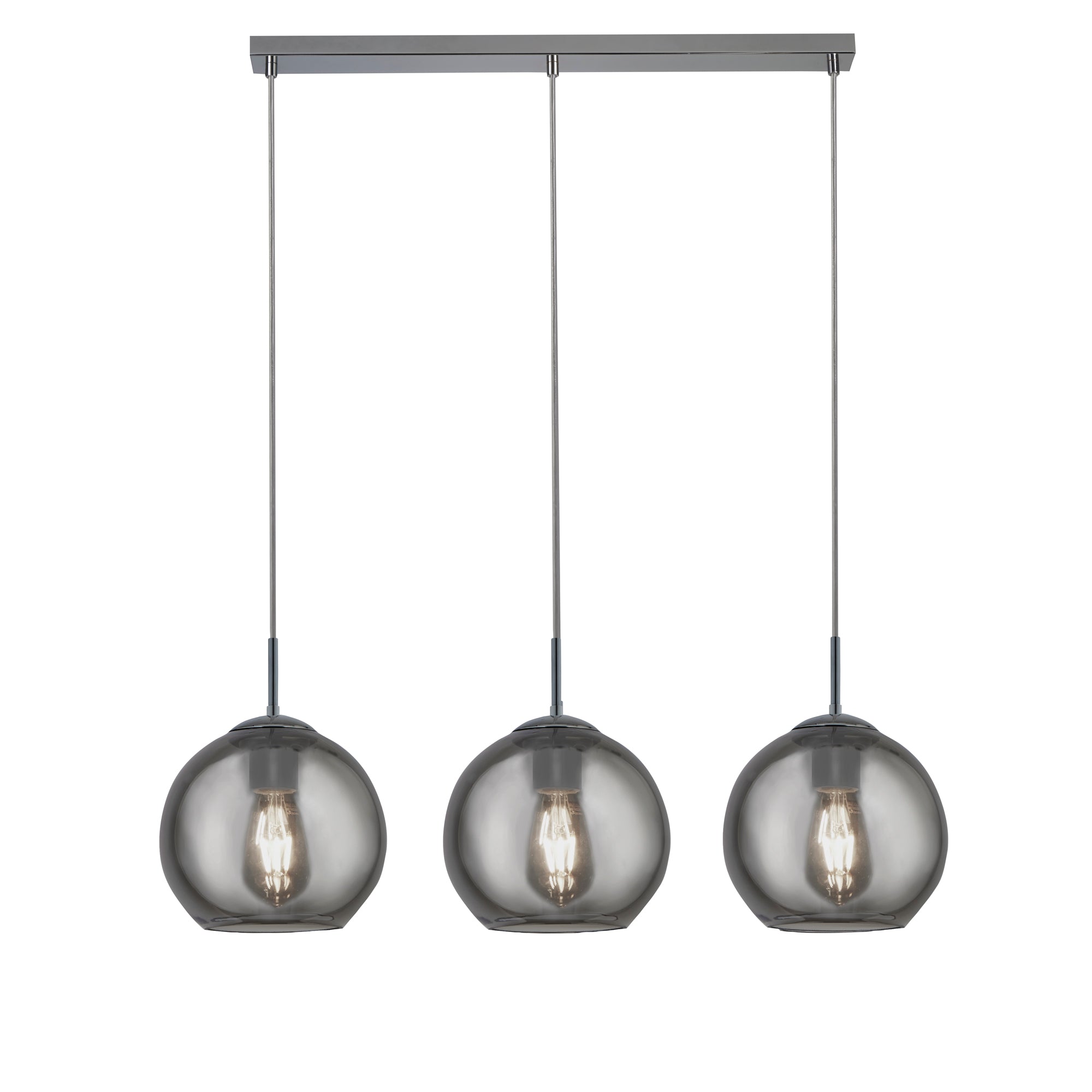 Chrome Metal & Smoked Glass: Revamp your living space with our 3 light Balls bar pendant has smoked glass shades with a chrome finish. The glass ball shades make this a distinctive product to hang in your kitchen area whether it's above a kitchen island or a dining room table.