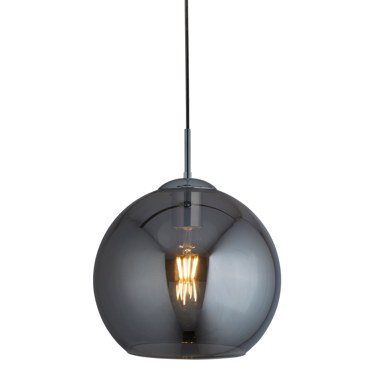 Chrome Metal & Smoked Glass: Create a distinctive look for any modern living space with this striking smoked glass round pendant. When lit, the smoked glass effect contrasts beautifully against the light; accenting the brightness of glow. The fitting suspends delicately from a slim chrome stem, proceeding to a chrome base for a classic finish.