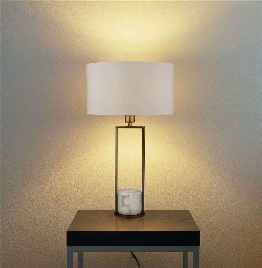 The Claire table lamp comes with a marble base surrounded by a bold gold rectangle, and topped with a white drum shade. The table lamp is great for a modern home, in either a lounge, bedroom or hallway.
